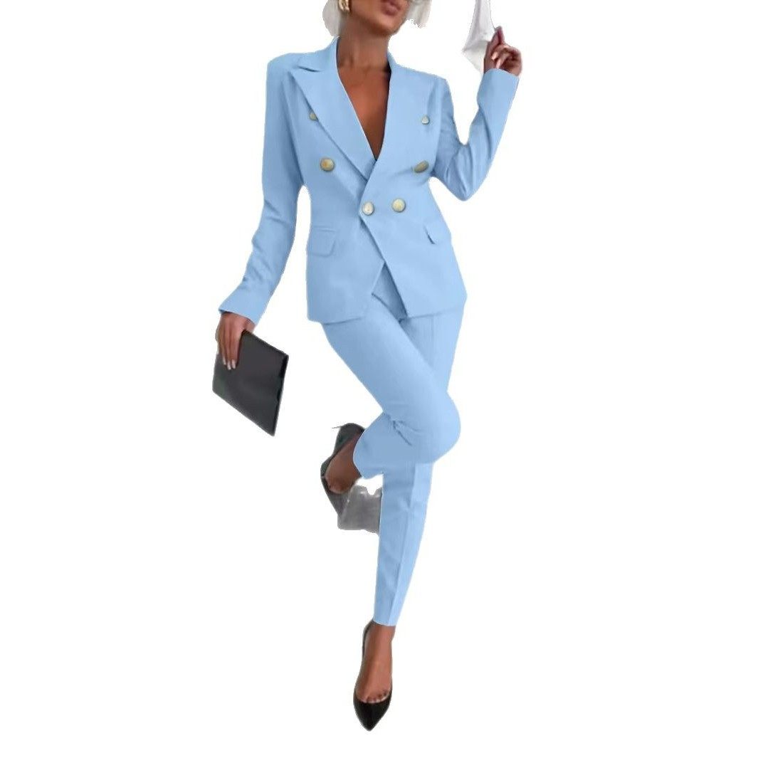 两件套小个子高级气质职业装 芝美日禾 女裤 套装 午夜蓝双排扣西装