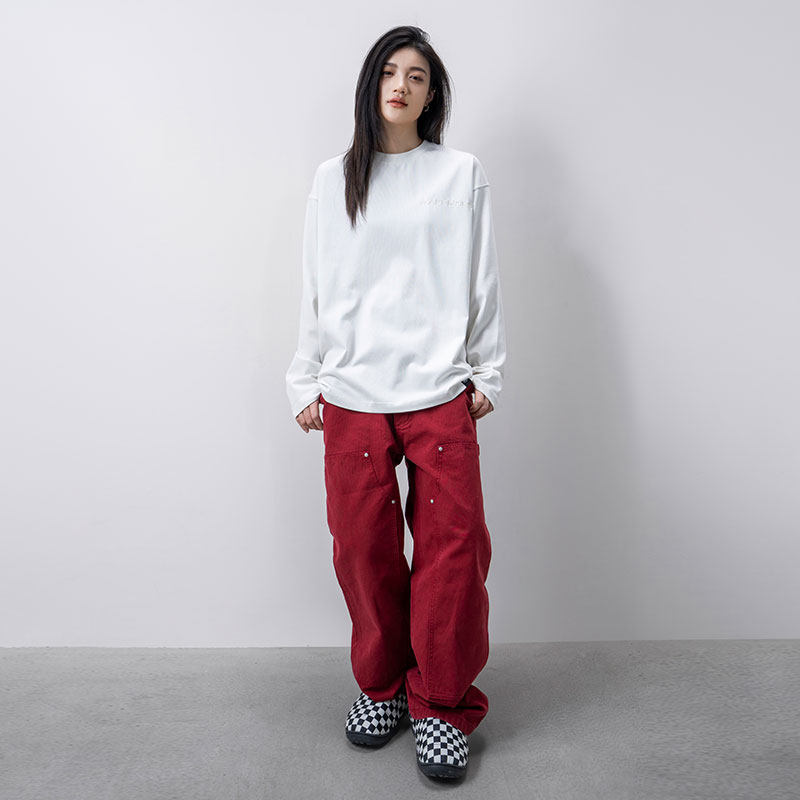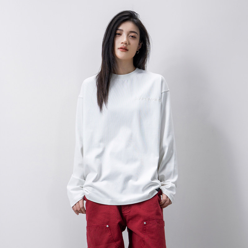 休闲宽松情侣T恤男 立体托底刺绣皮标白色美式 Makemore长袖 男新款
