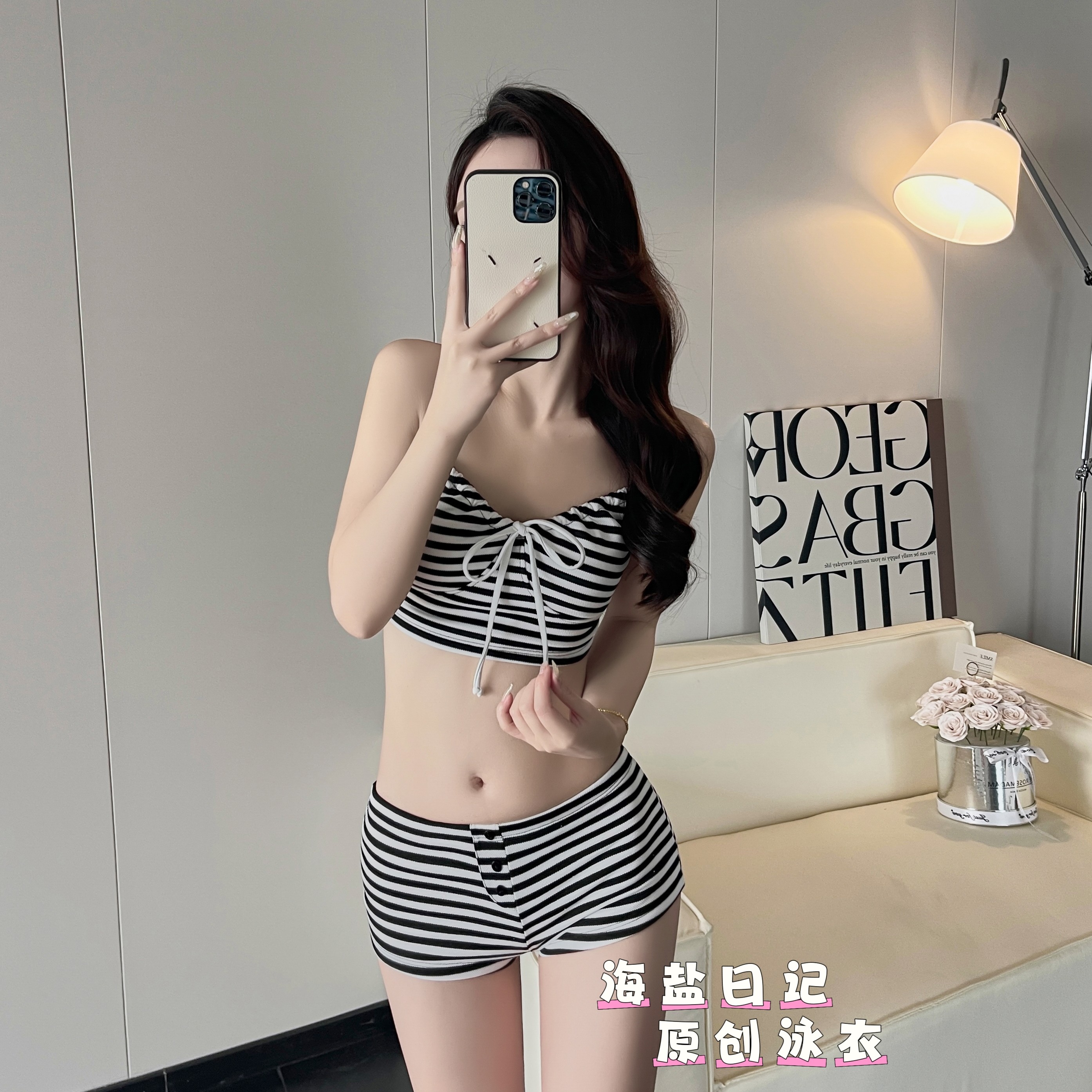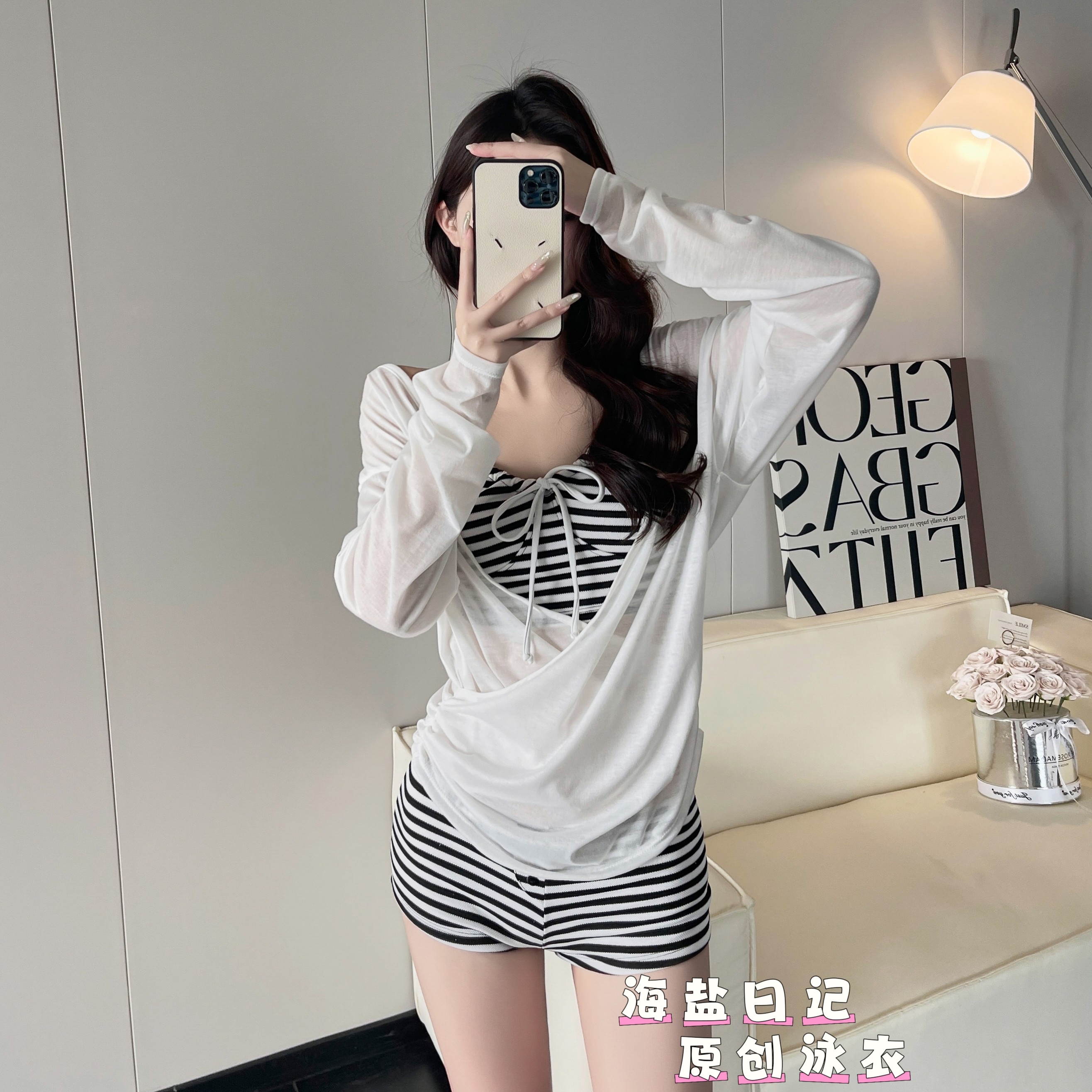 新款 平角保守度假温泉泳衣女 纯欲甜美条纹高级感绝美女士微透罩衫