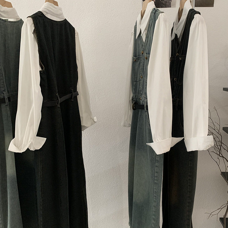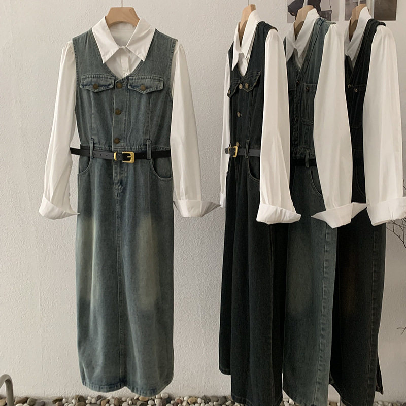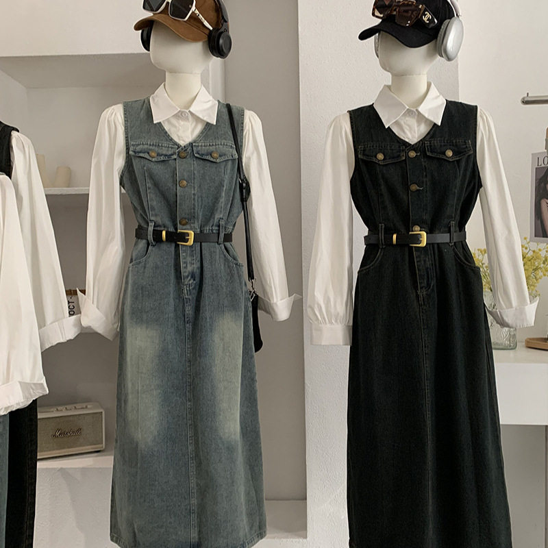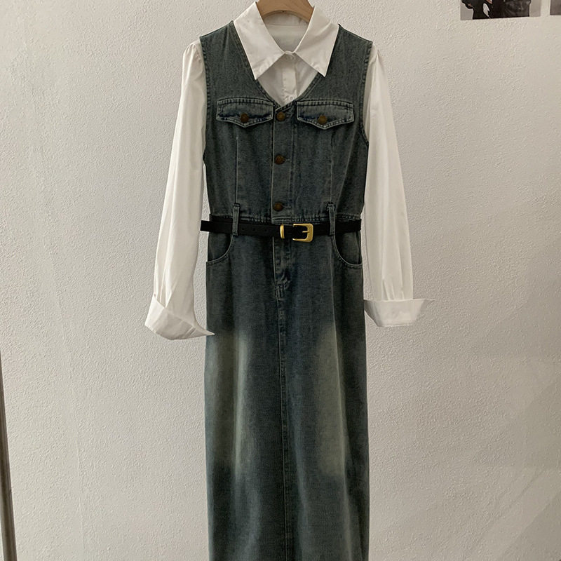 两件套送腰带女 白衬衫 无袖 背心牛仔连衣裙配翻领长袖