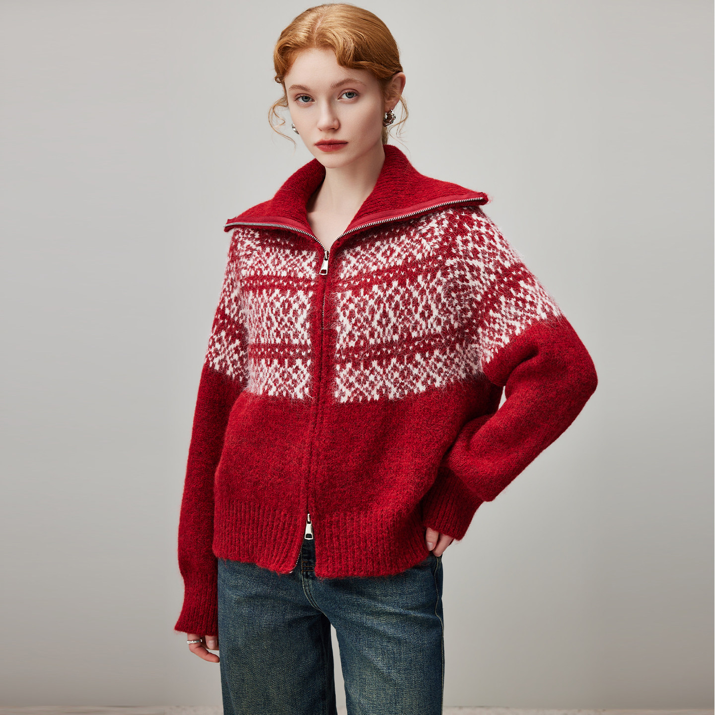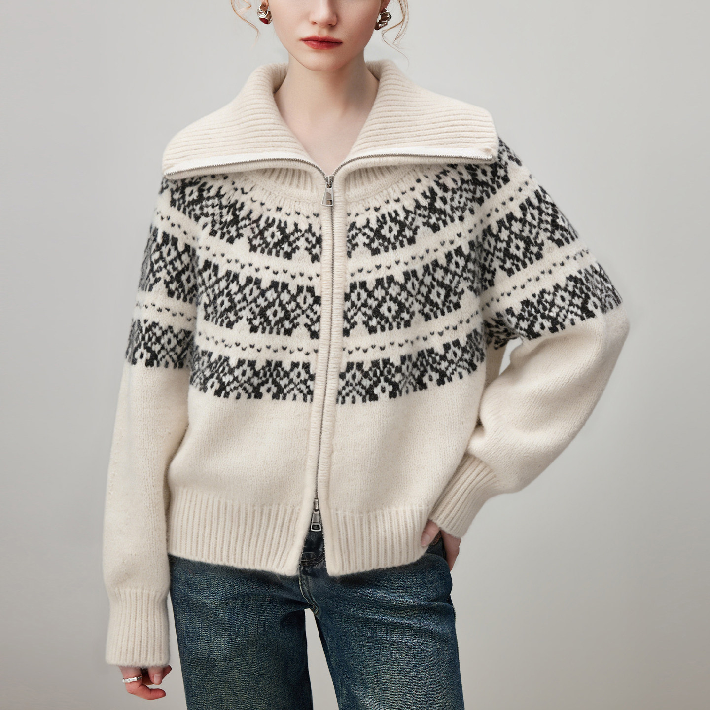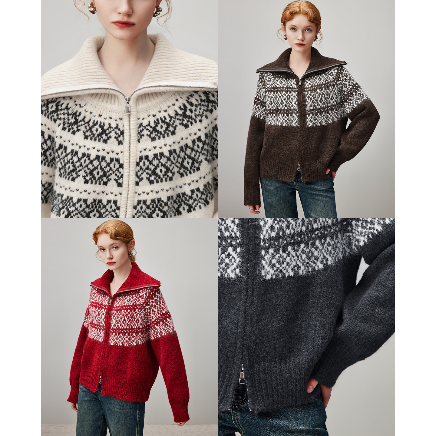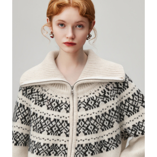翻领加厚针织衫 新款 毛衣外套女2026年春季 dfvc复古费尔岛提花开衫