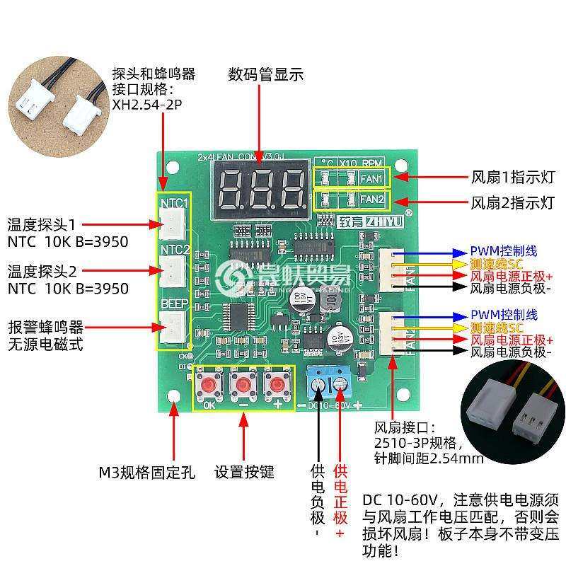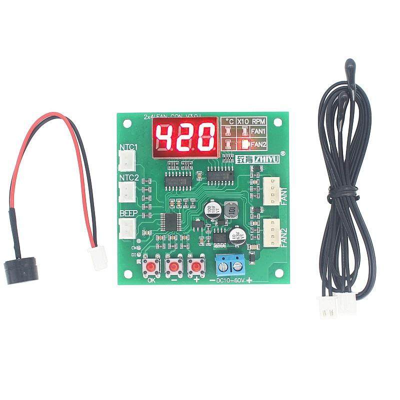 风扇温控调速器 两路四线PWM风扇12V24V48V温度转速显示停转报警