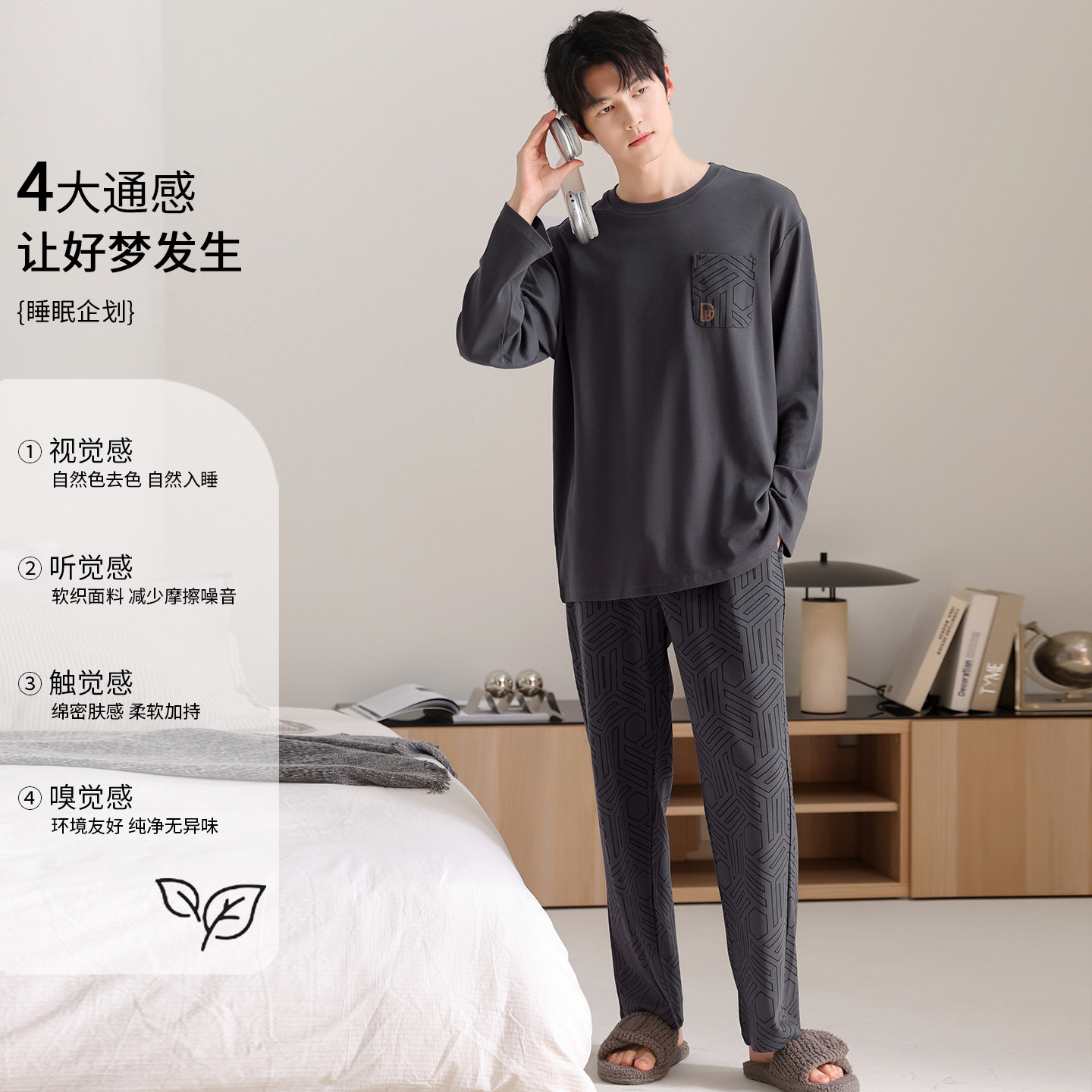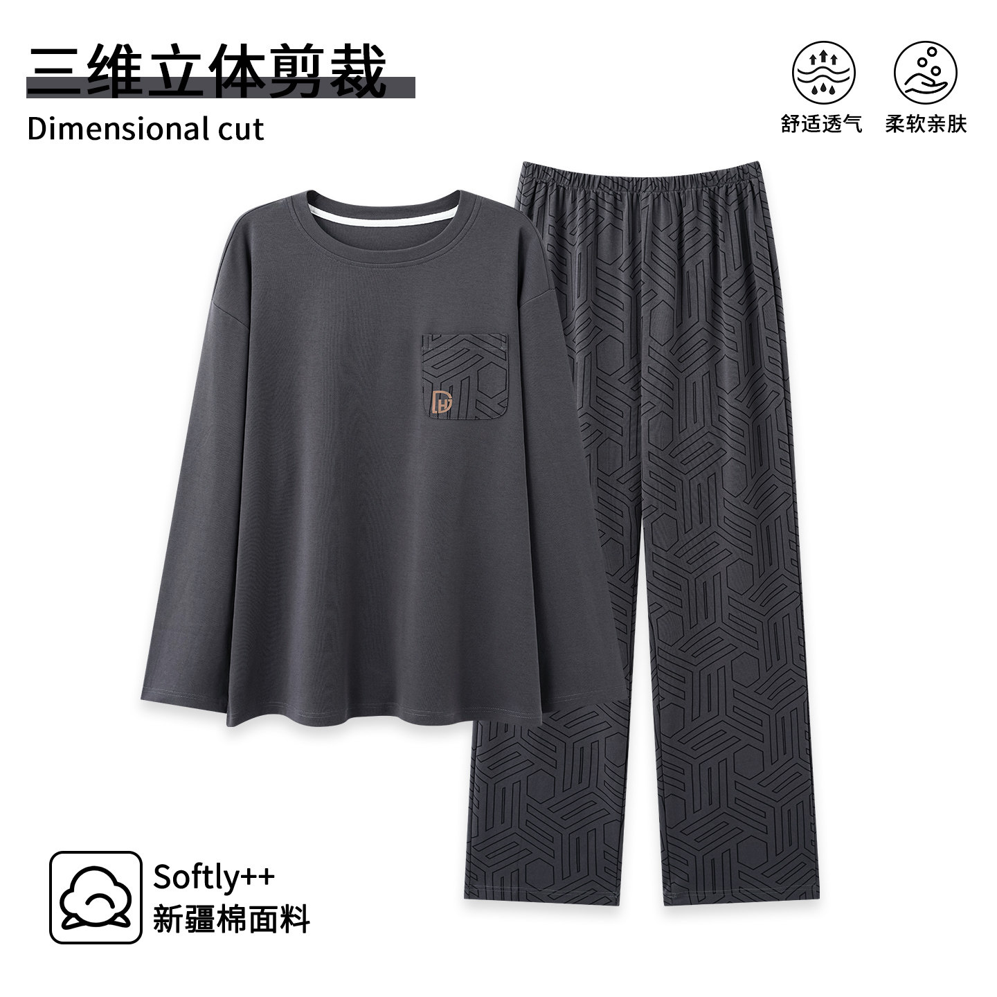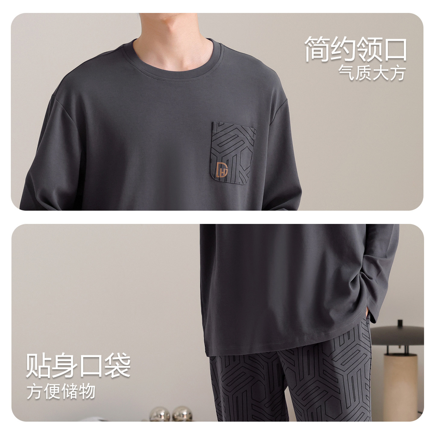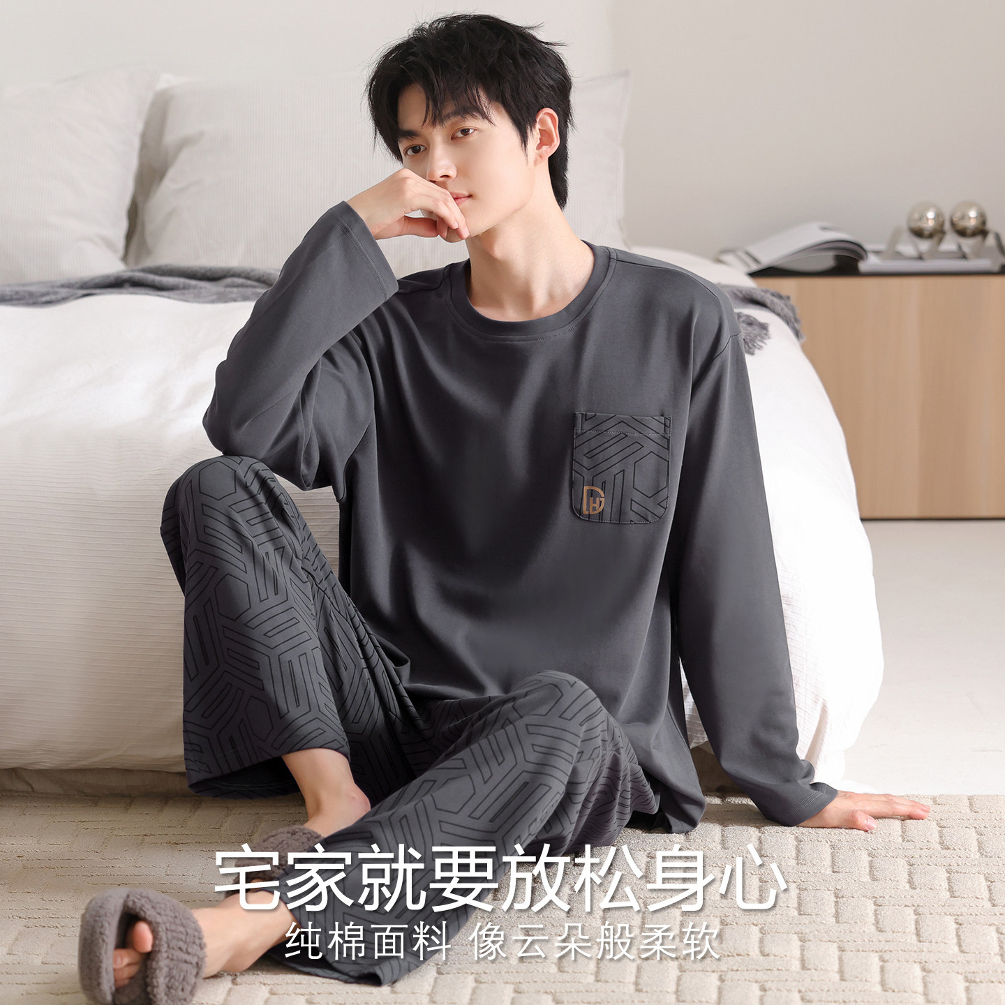 睡衣男款 大码 秋季 长袖 深灰家居服秋冬天 纯棉2026新款 芬腾可安男士