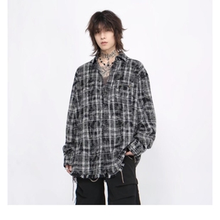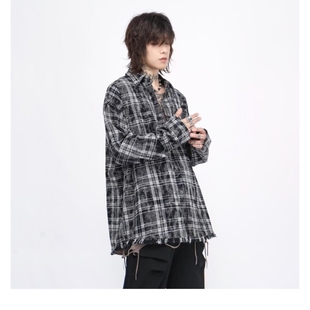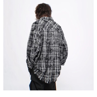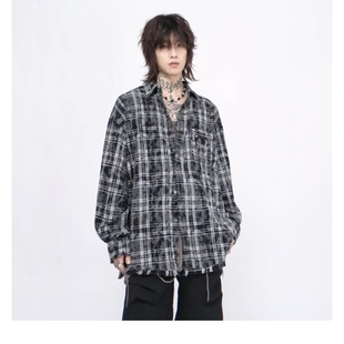 宽松百搭外套情侣装 美式 毛边男女春秋季 衬衫 复古扎染格子休闲长袖