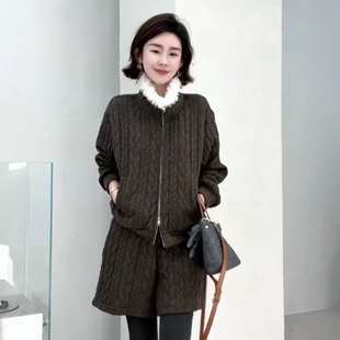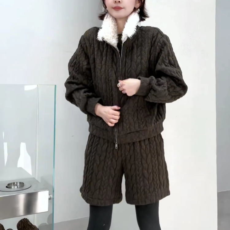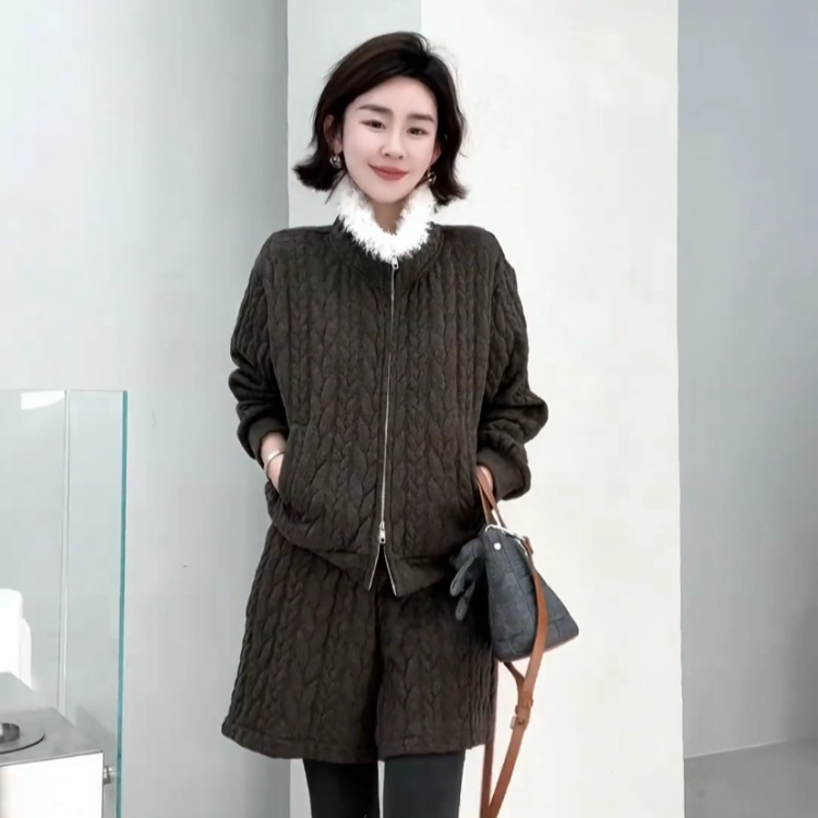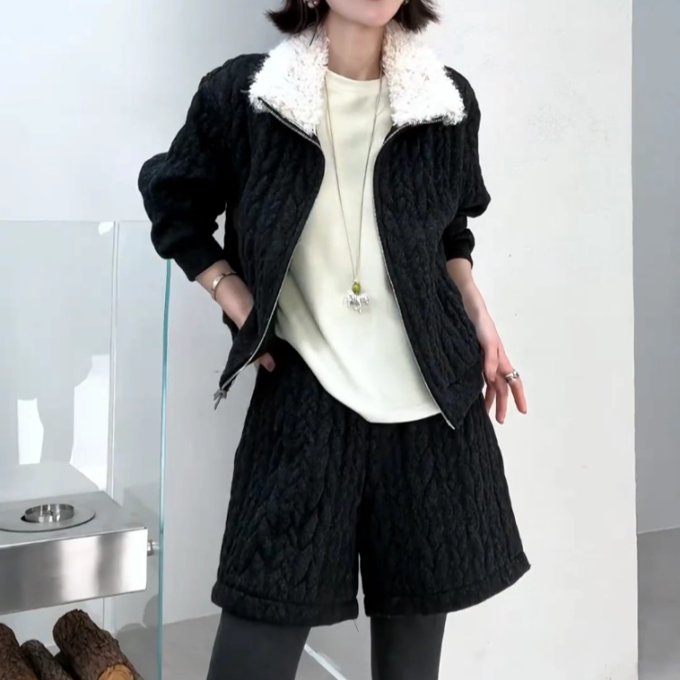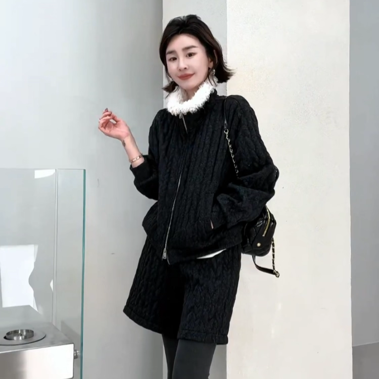 时尚 拼羊羔毛立领短外套阔腿裤 加棉套装 新款 两件套 女2025冬季 韩版