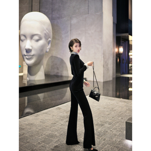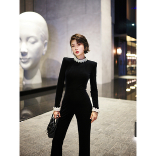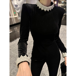 XULU原创秋冬进口黑色丝绒重工珍珠编条修身 高腰气质半高领连体裤