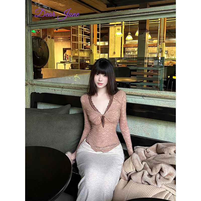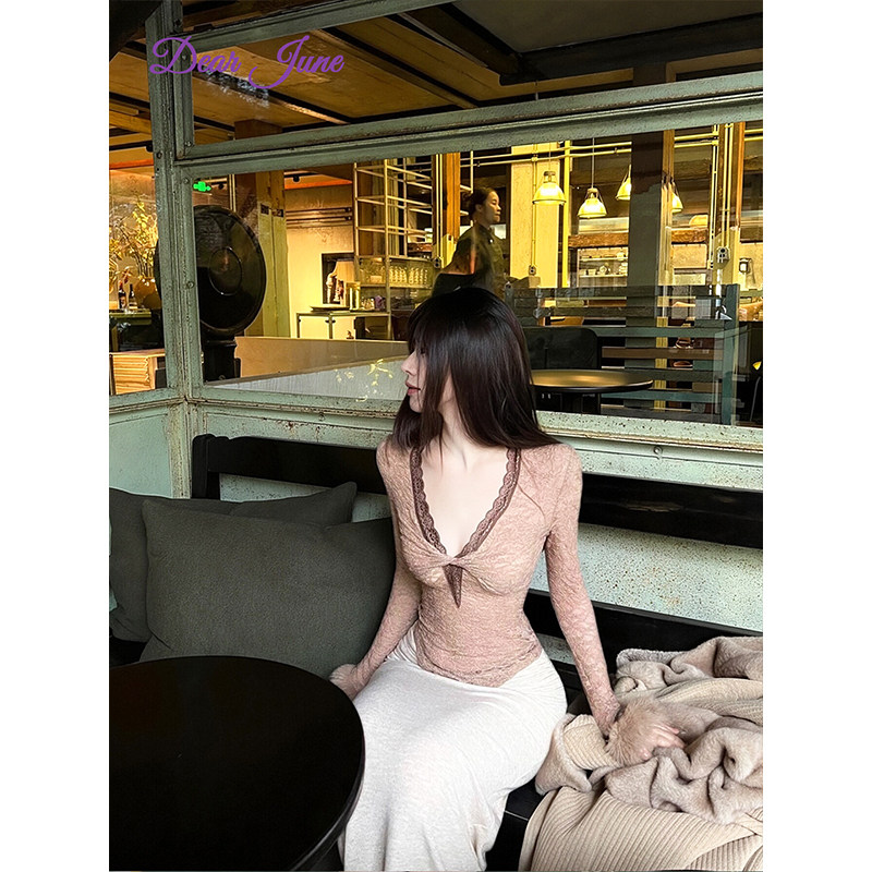 纯欲设计感辣妹chic 口上衣修身 DearJune 韩系性感蕾丝拼接毛毛袖