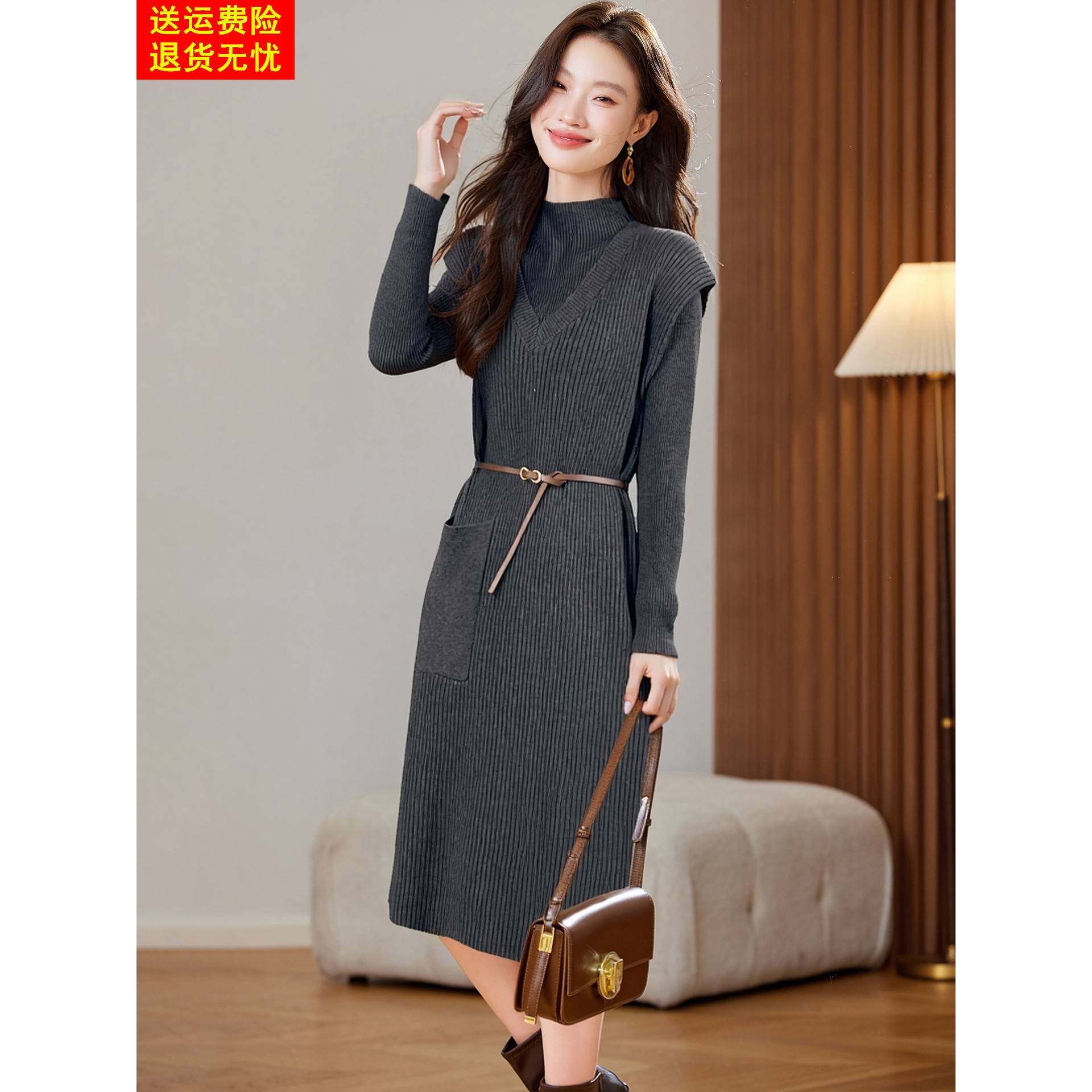 时尚 收腰叠穿毛衣裙套裙女 贵夫人秋冬针织马甲连衣裙小个子中长款