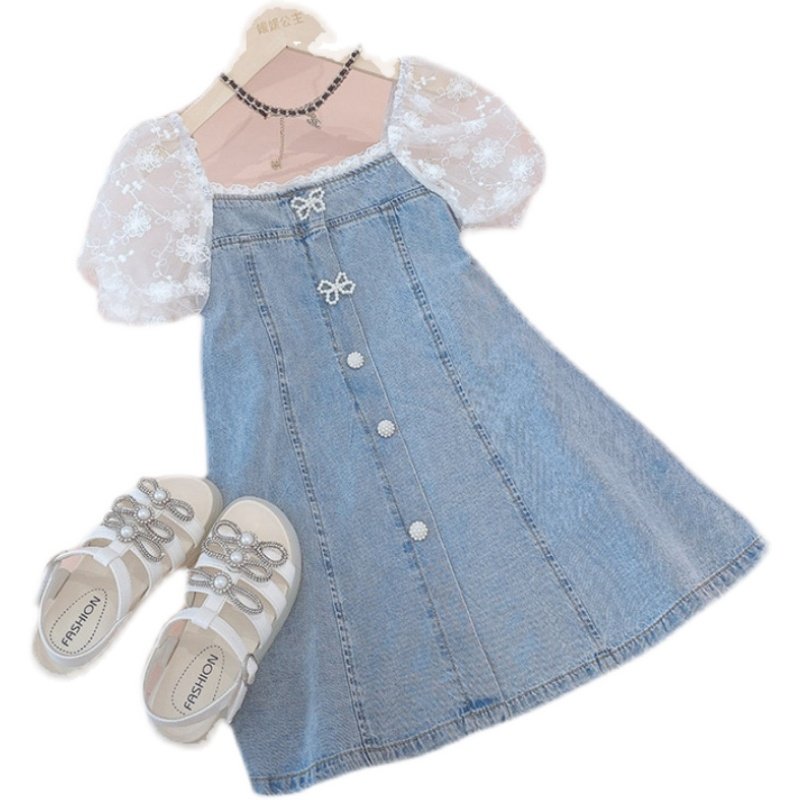 女宝宝泡泡袖 新款 公主连衣裙子潮 蕾丝花边牛仔裙2021夏季 女童短袖