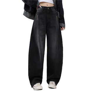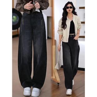 高拼接刺绣镰刀阔腿裤 女2025款 弯刀牛仔裤 拉夏贝尔加绒黑灰色窄版