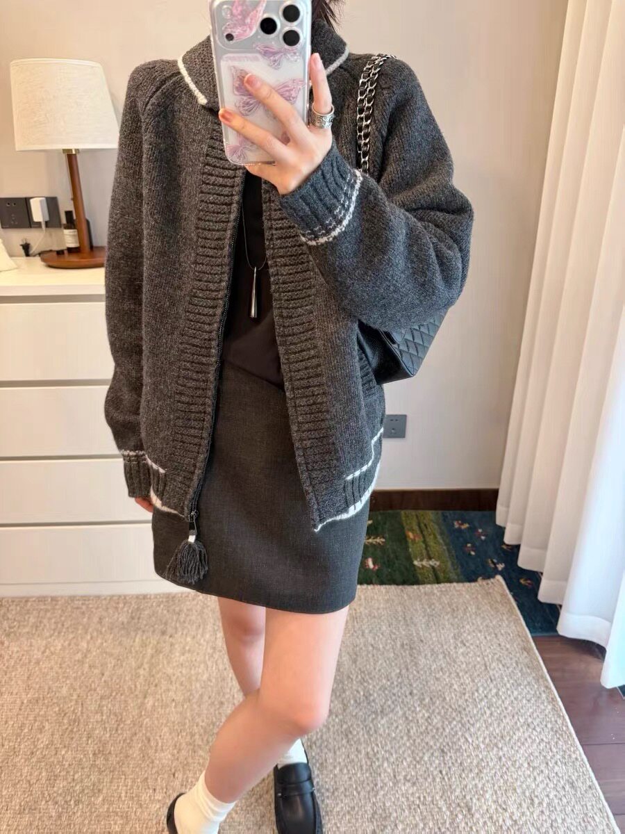 REWEAR 16164 澳大利亚进口荃羊毛重磅翻立领流苏拉链撞色针织开衫