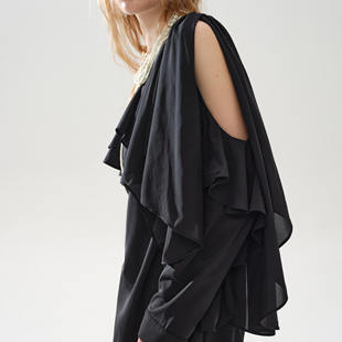 黑色 斜肩不规则设计连衣裙 Layers 立体层次褶皱花边