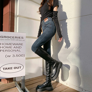 高腰遮胯休闲直筒裤 拉夏贝尔复古加绒窄版 新款 女秋冬季 阔腿牛仔裤