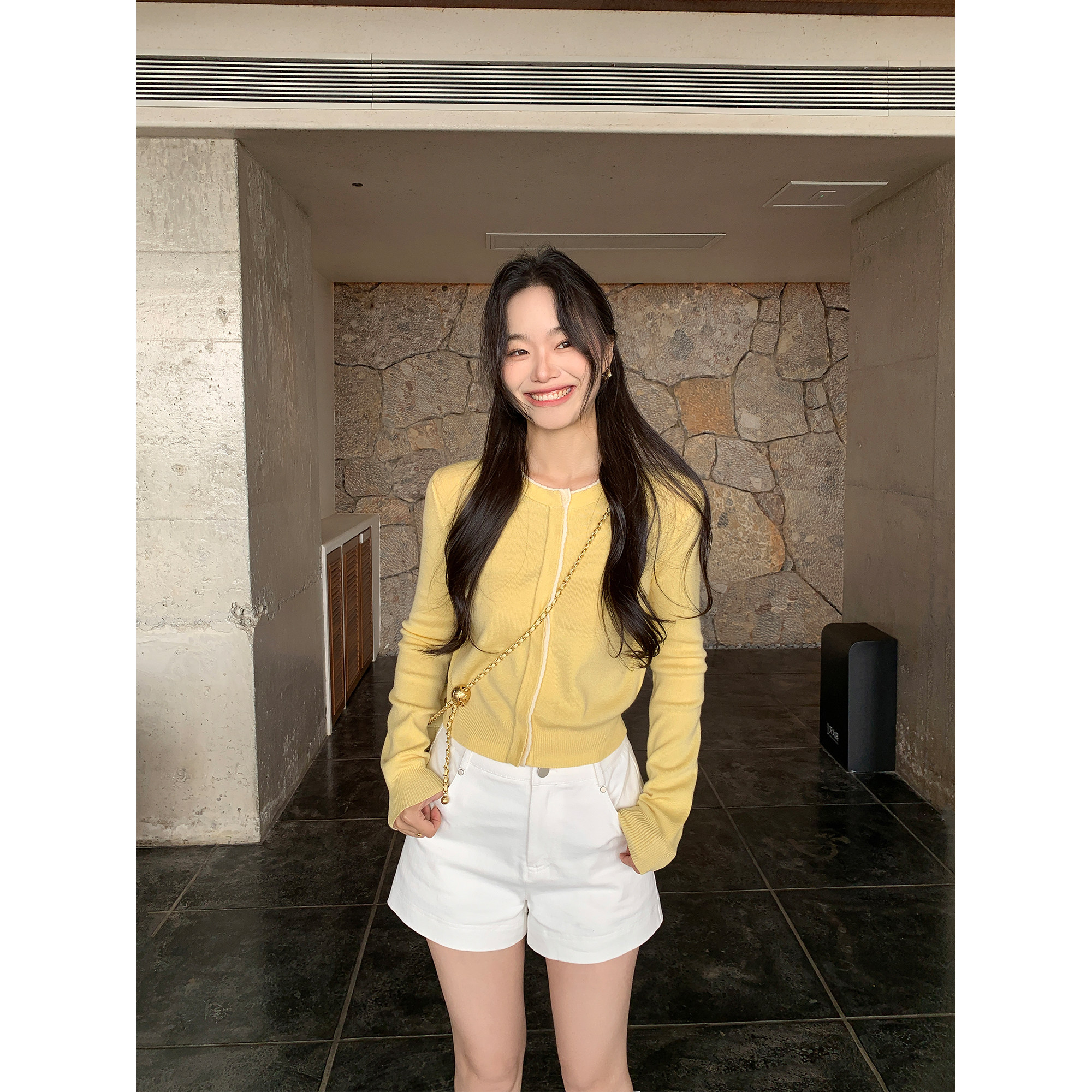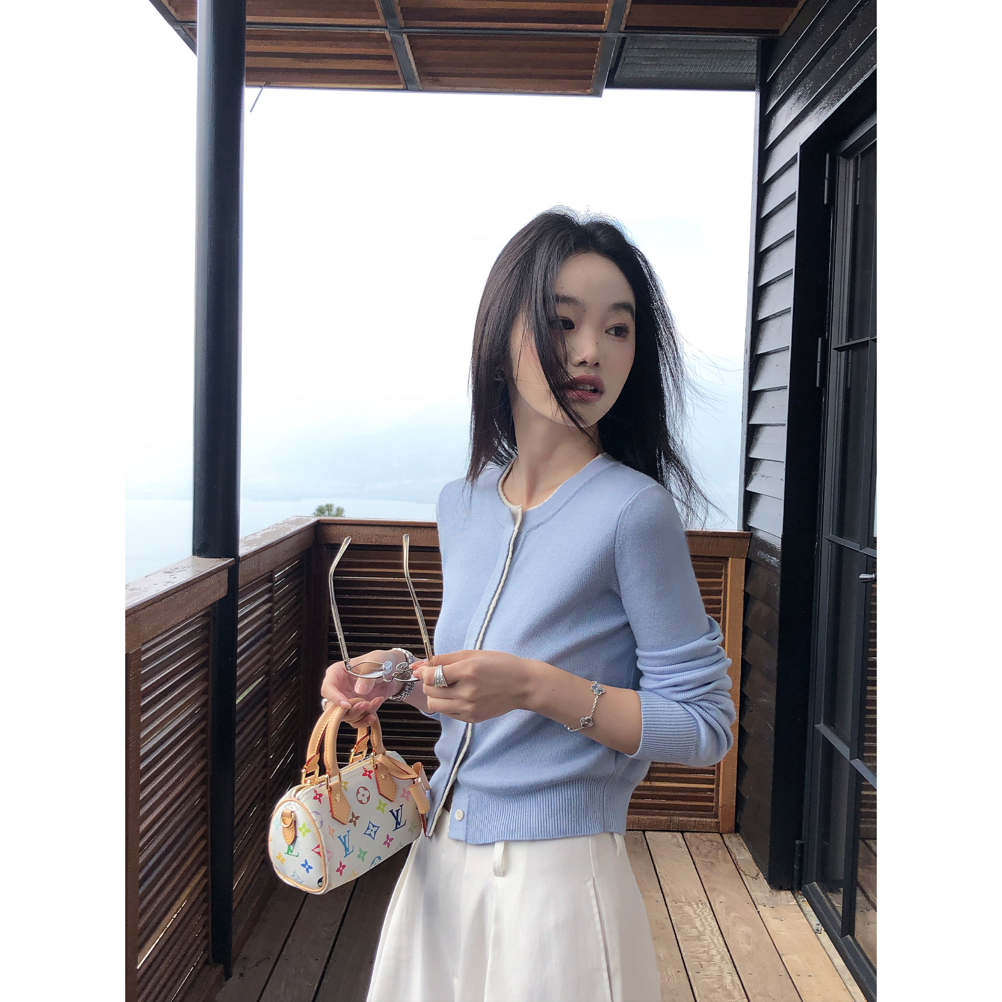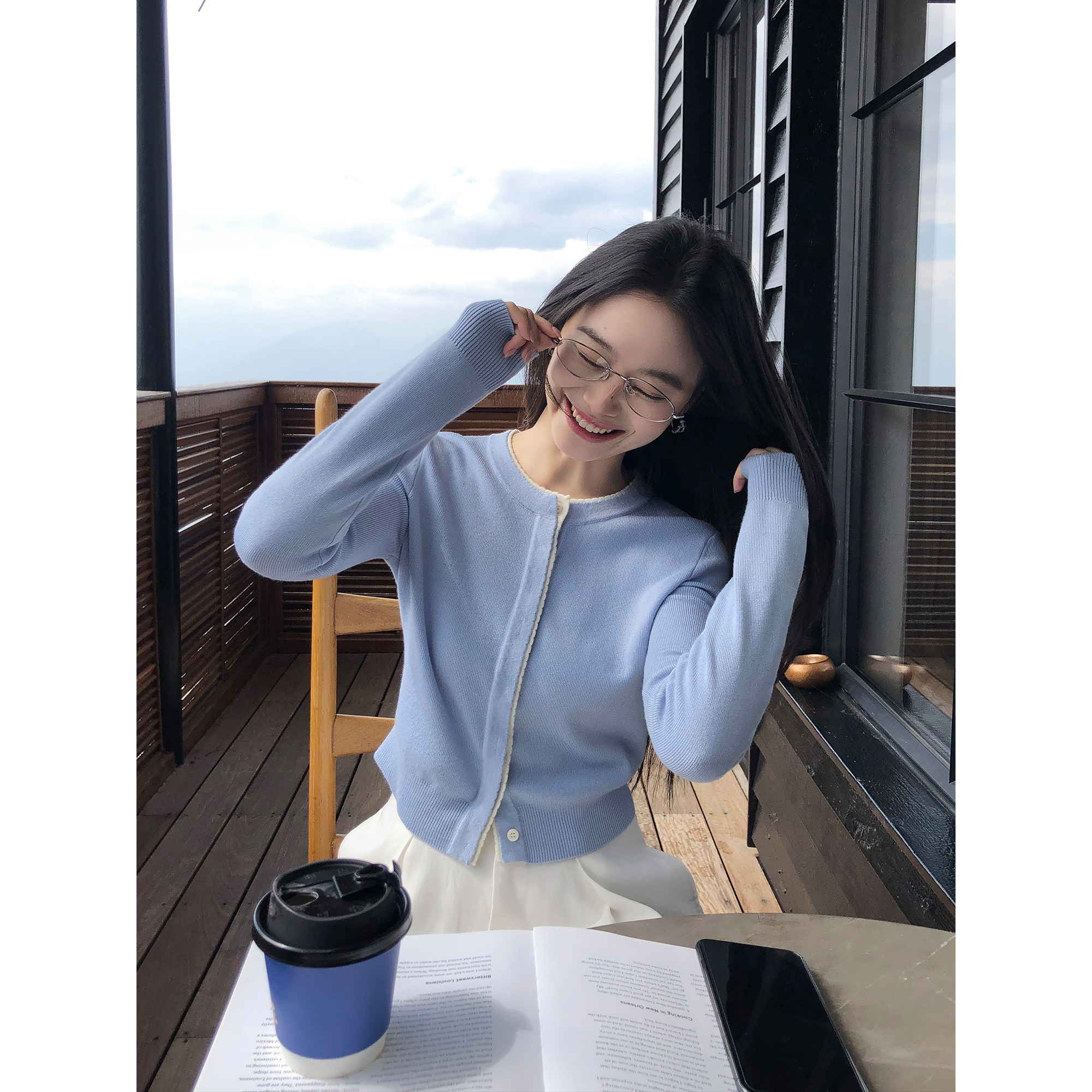 长袖 pusumede 女设计感短款 撞色假两件圆领针织开衫 上衣 知性美学
