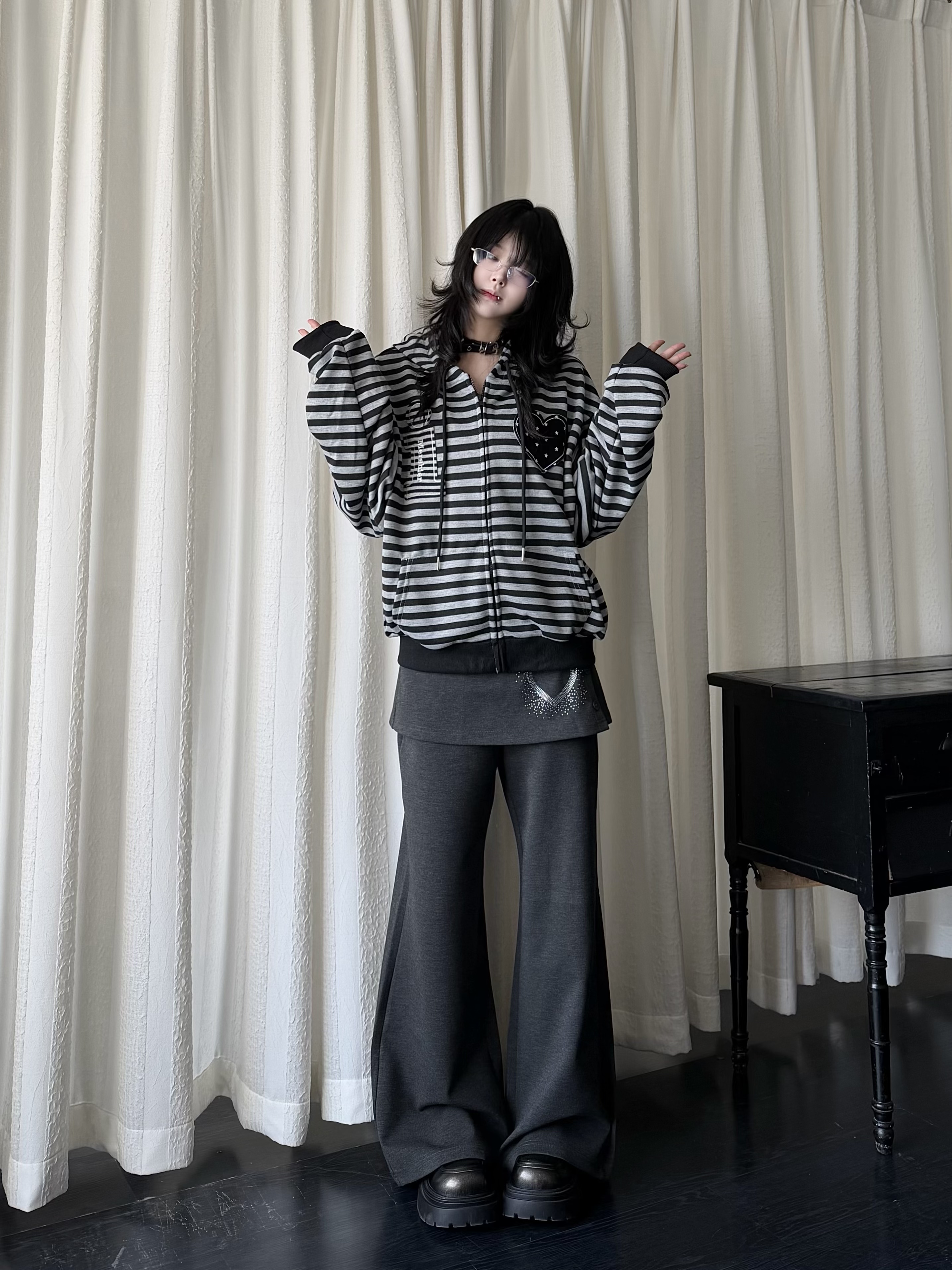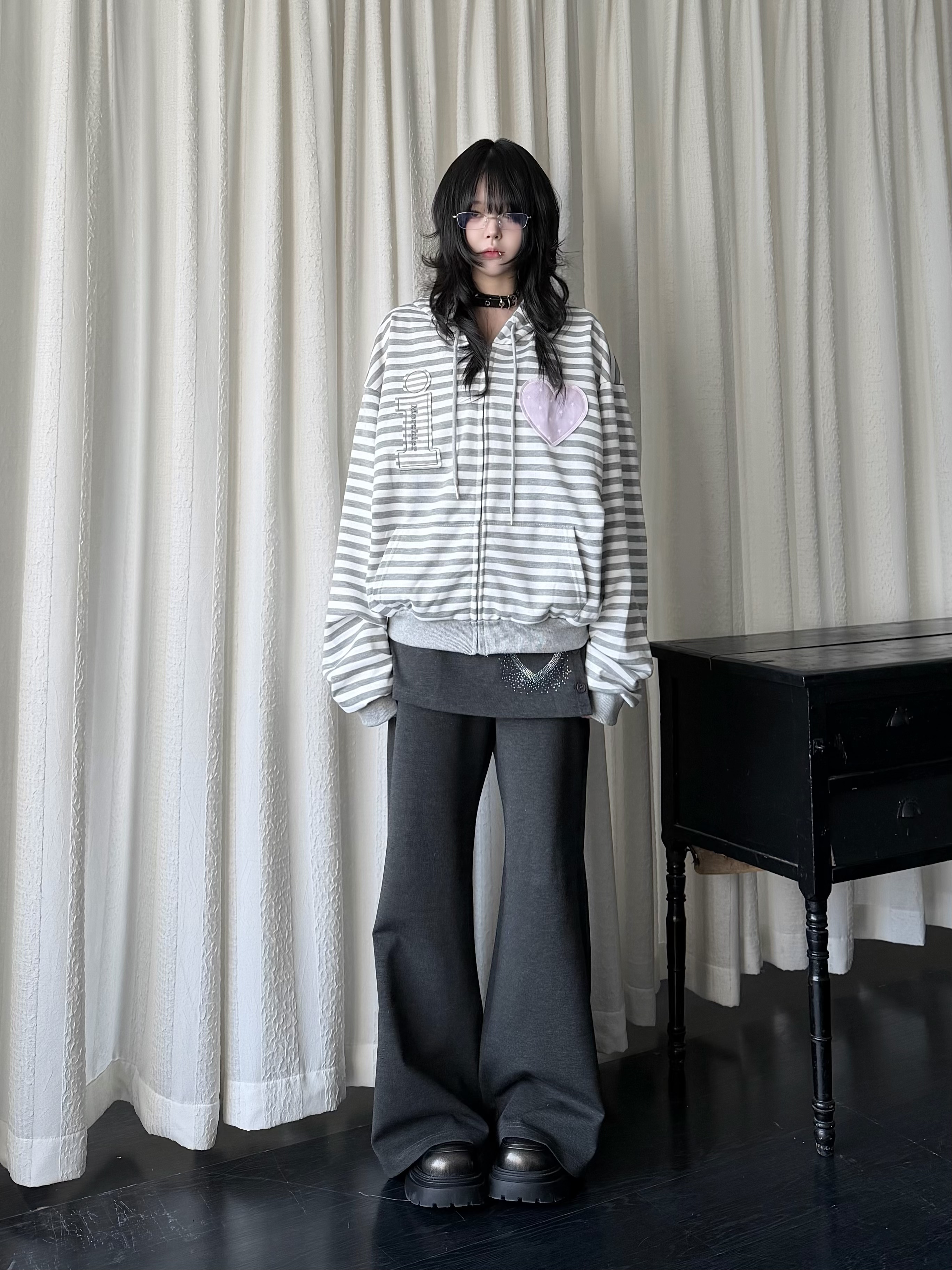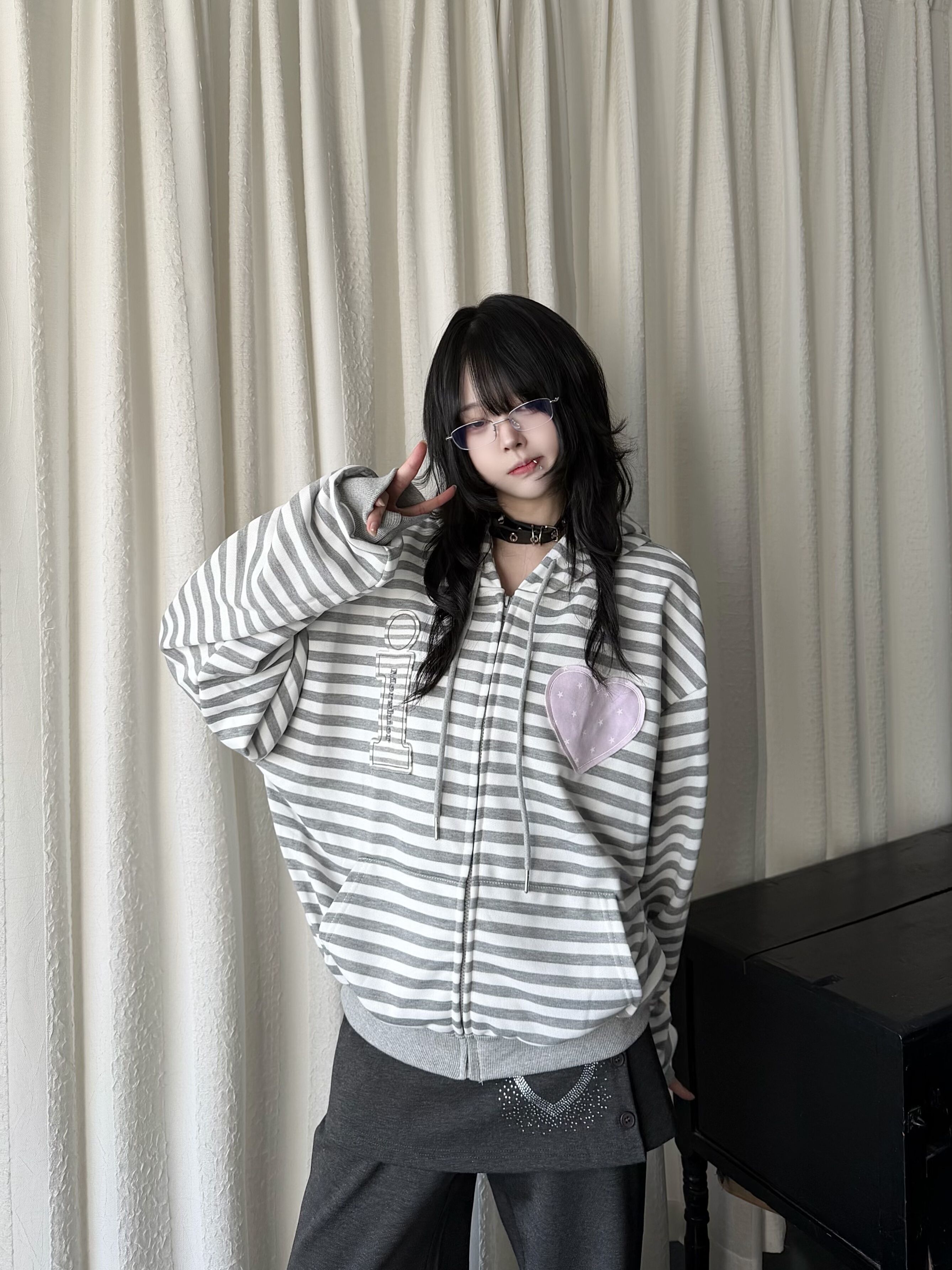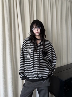 咖喱人春季 宽松连帽卫衣女Y2K轻亚风古早感外套 条纹爱心贴布开衫