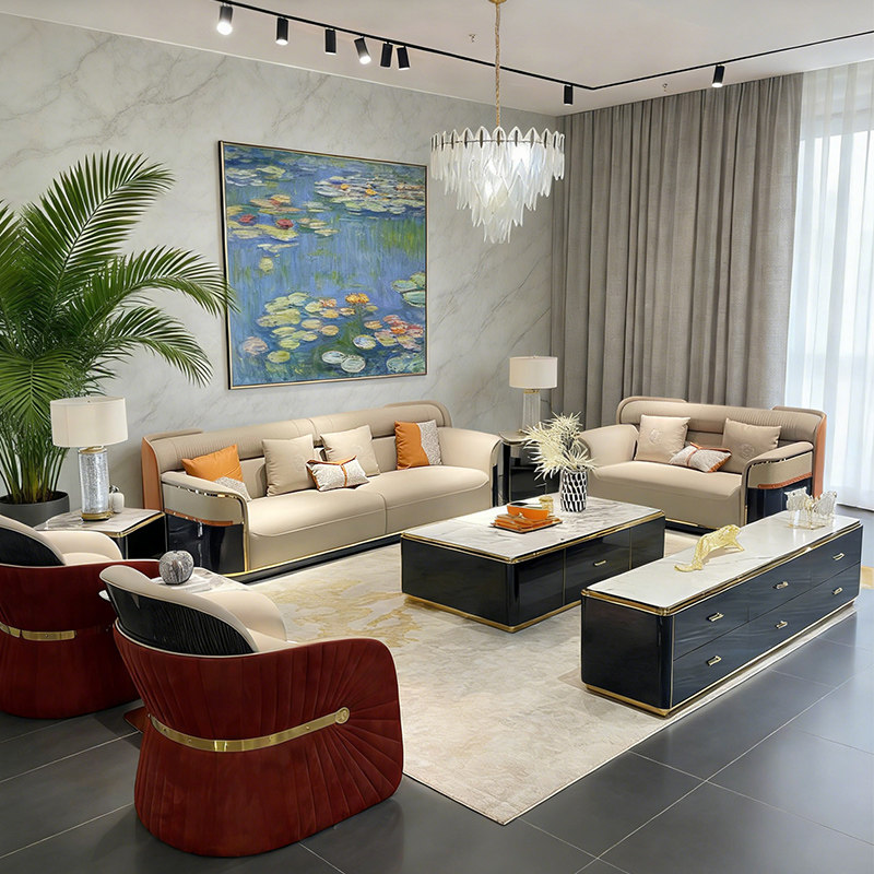 家具 别墅大小户型客厅整装 意式 轻奢高靠背真皮沙发组合后现代港式