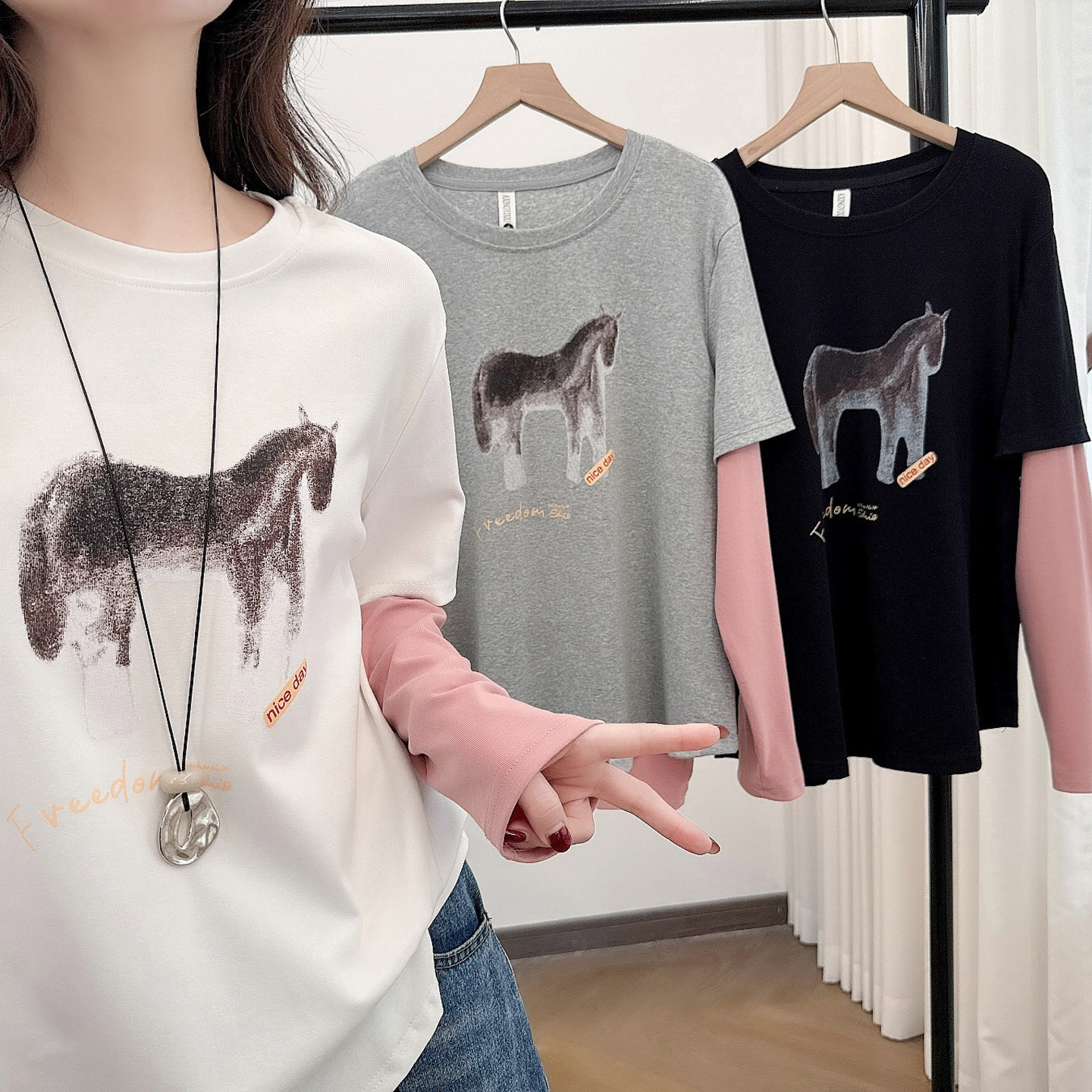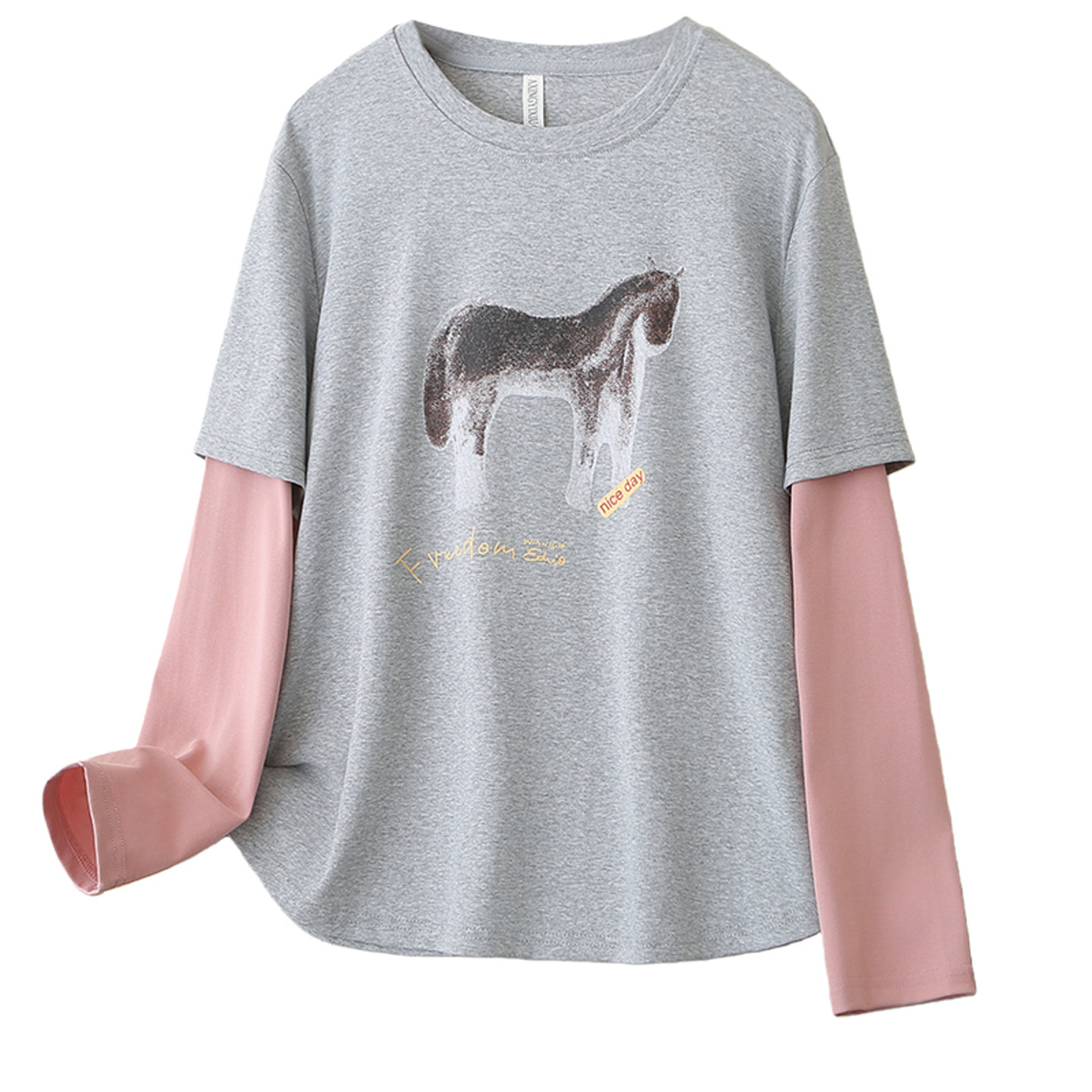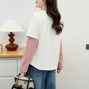 胖mm200斤小马印花撞色假两件打底衫 长袖 春季 2026年新款 t恤女大码