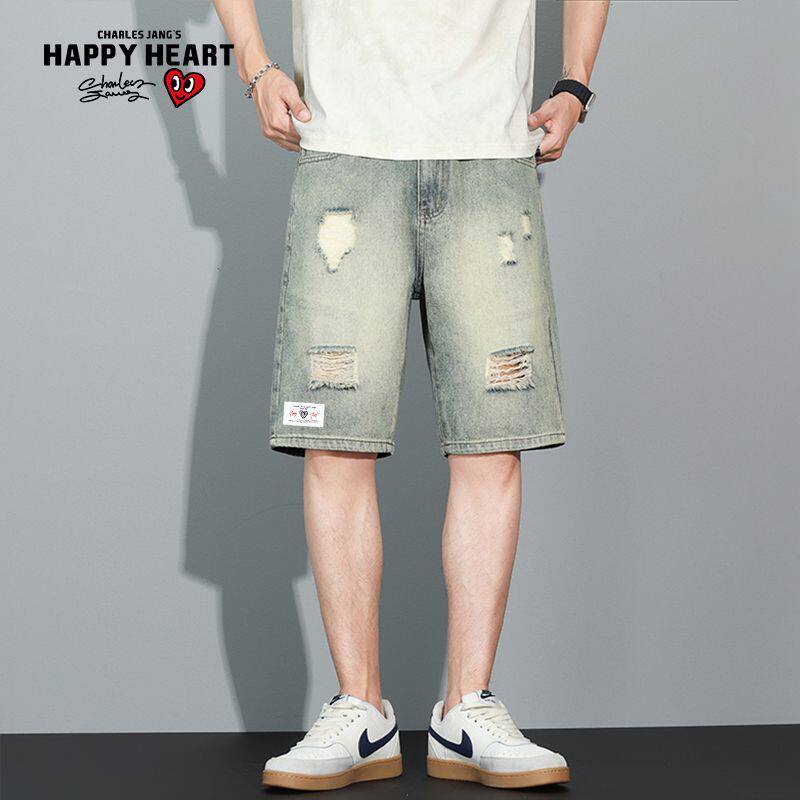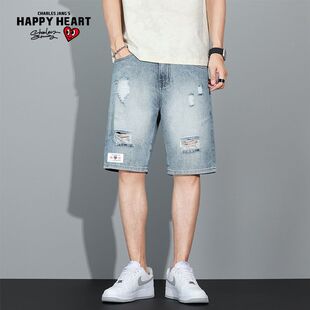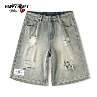 复古水洗做旧破洞五分直筒牛仔短裤 情侣美式 男 新款 查尔斯桃心夏季