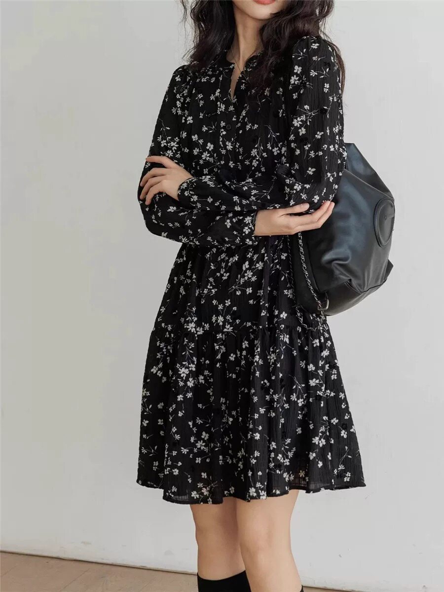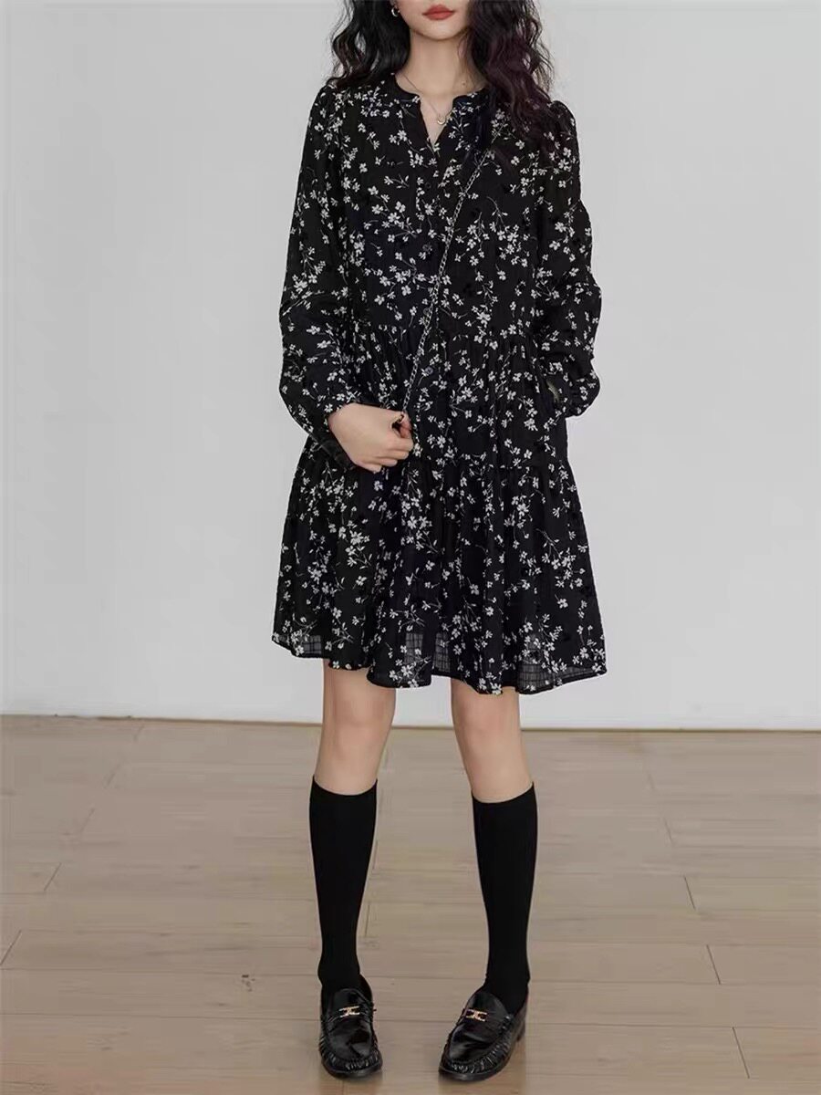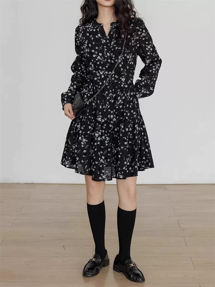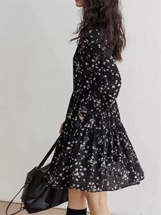 休闲收腰气质短裙 v领长袖 欧洲站复古碎花连衣裙女春季 2026新款