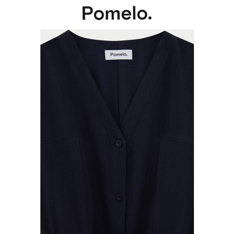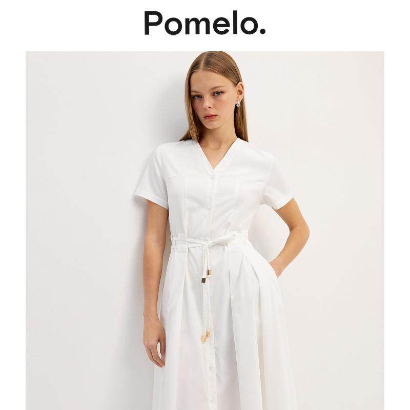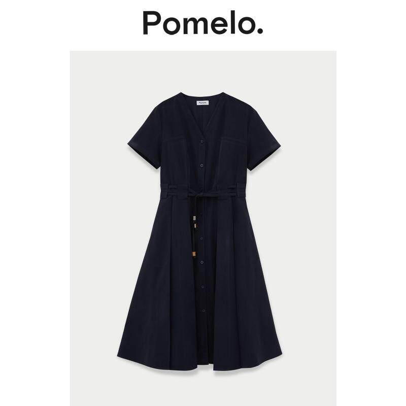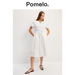 式 Pomelo 休闲度假衬衫 V领长裙女系带收腰显瘦中长款 连衣裙 法式
