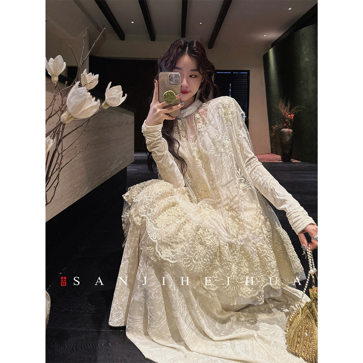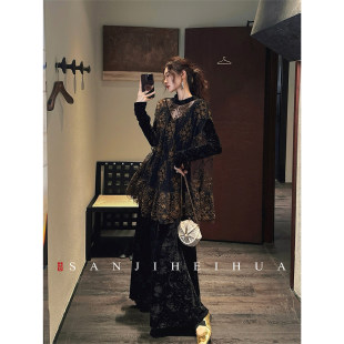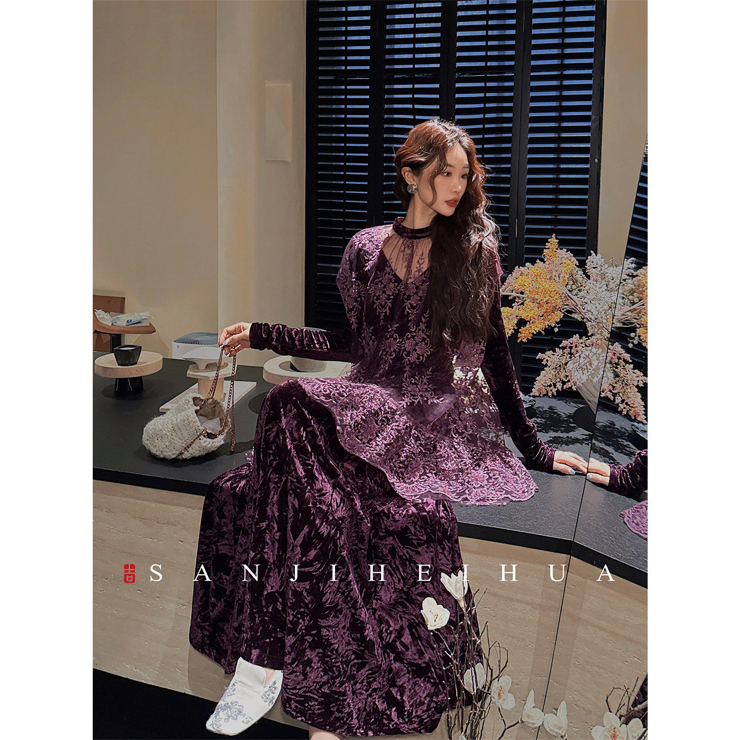 钉珠绣花丝绒秋冬季 琳琅 三吉黑花 连衣裙 呼呼专享