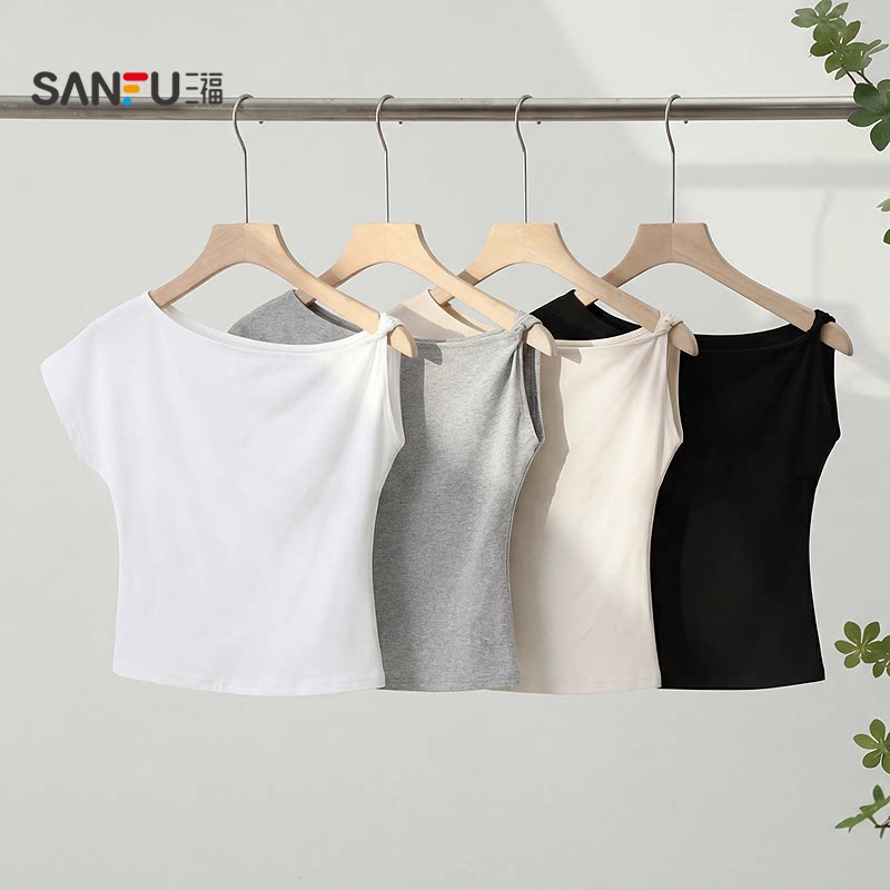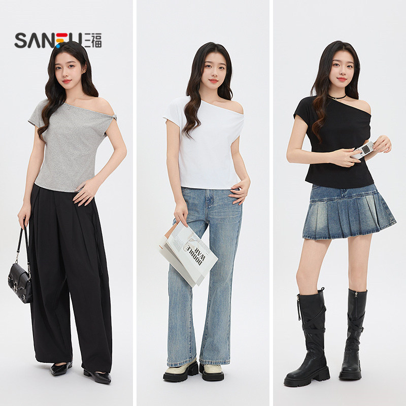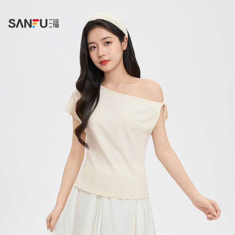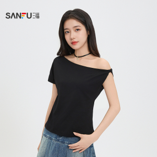 T恤女2026新款 上衣女装 夏季 子斜领露肩时尚 气质不规则袖 三福短袖