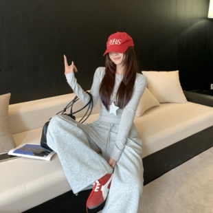 T恤阔腿裤 3MER哦哦三妹 修身 女长袖 子两件套 韩系慵懒粉色休闲套装