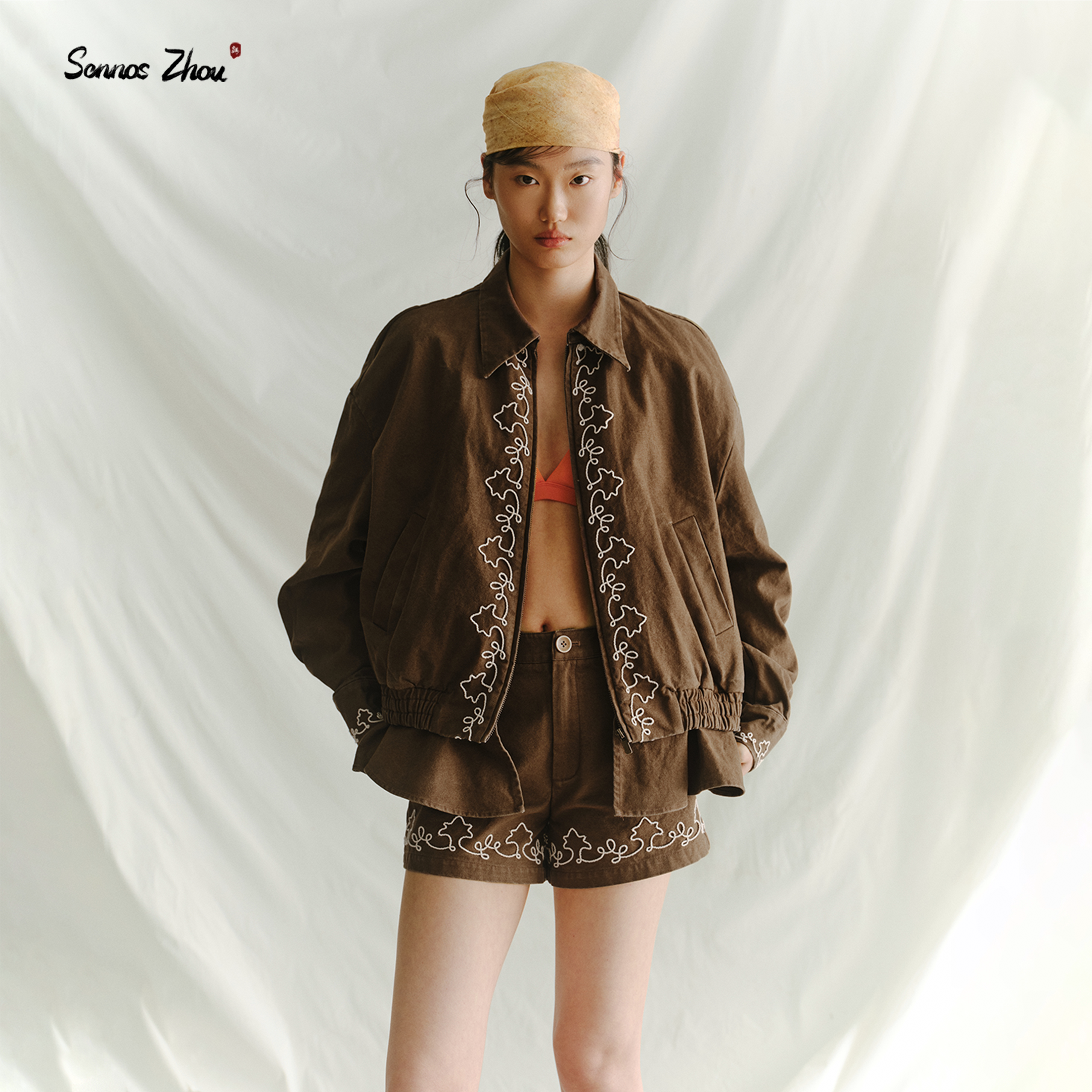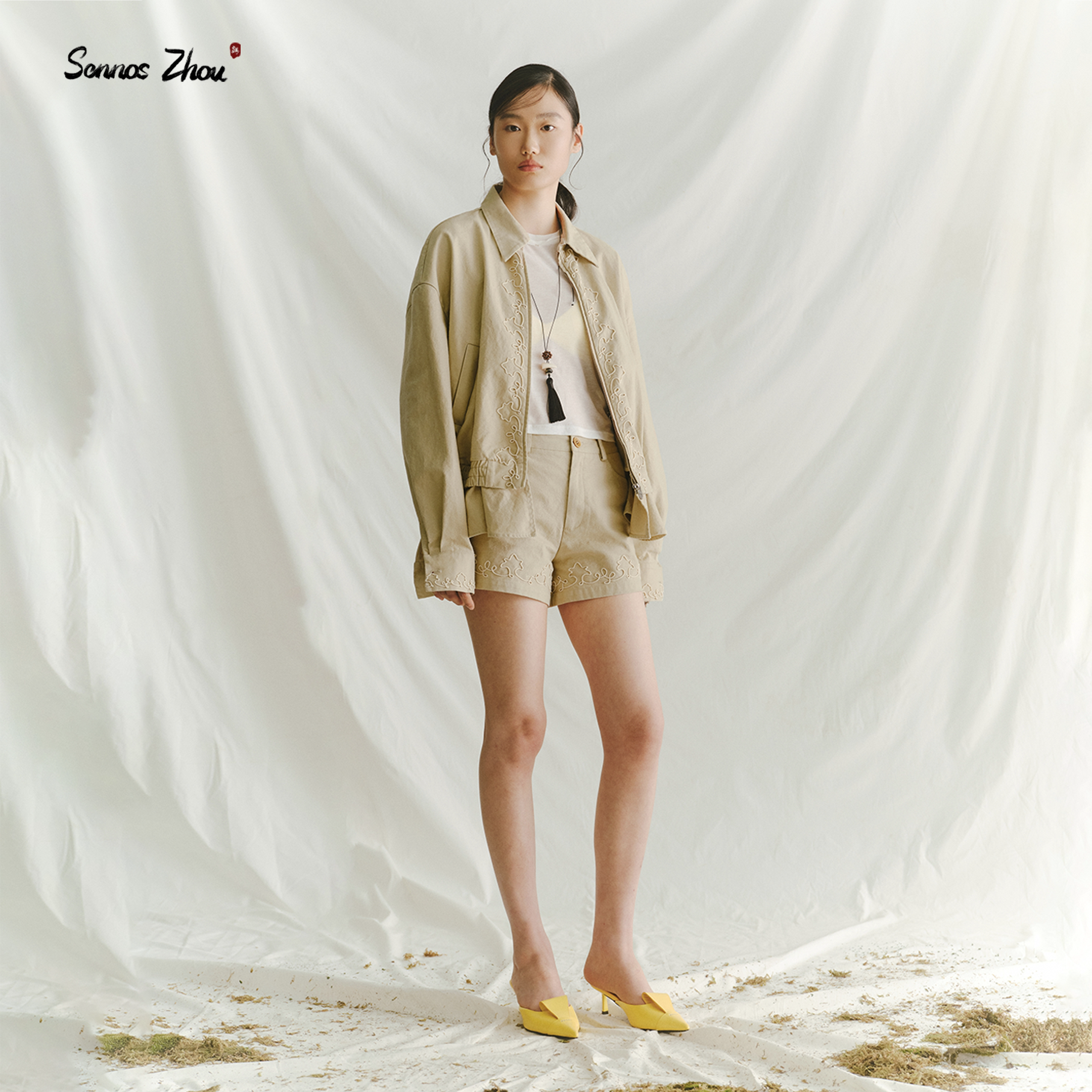 春 女米色刺绣休闲直筒热裤 「襟上云」sennos zhou绳绣水洗短裤