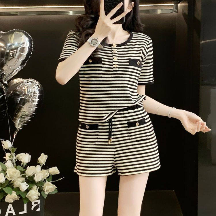 新款 两件套女2026夏季 韩版 时尚 潮 条纹短袖 休闲运动服套装 T恤短裤