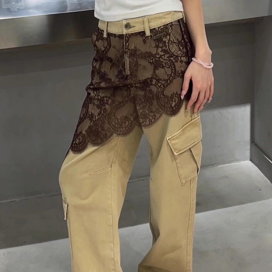古巴恩风工装 女2025新款 蕾丝拼接牛仔裤 休闲卡其直筒裤 现货