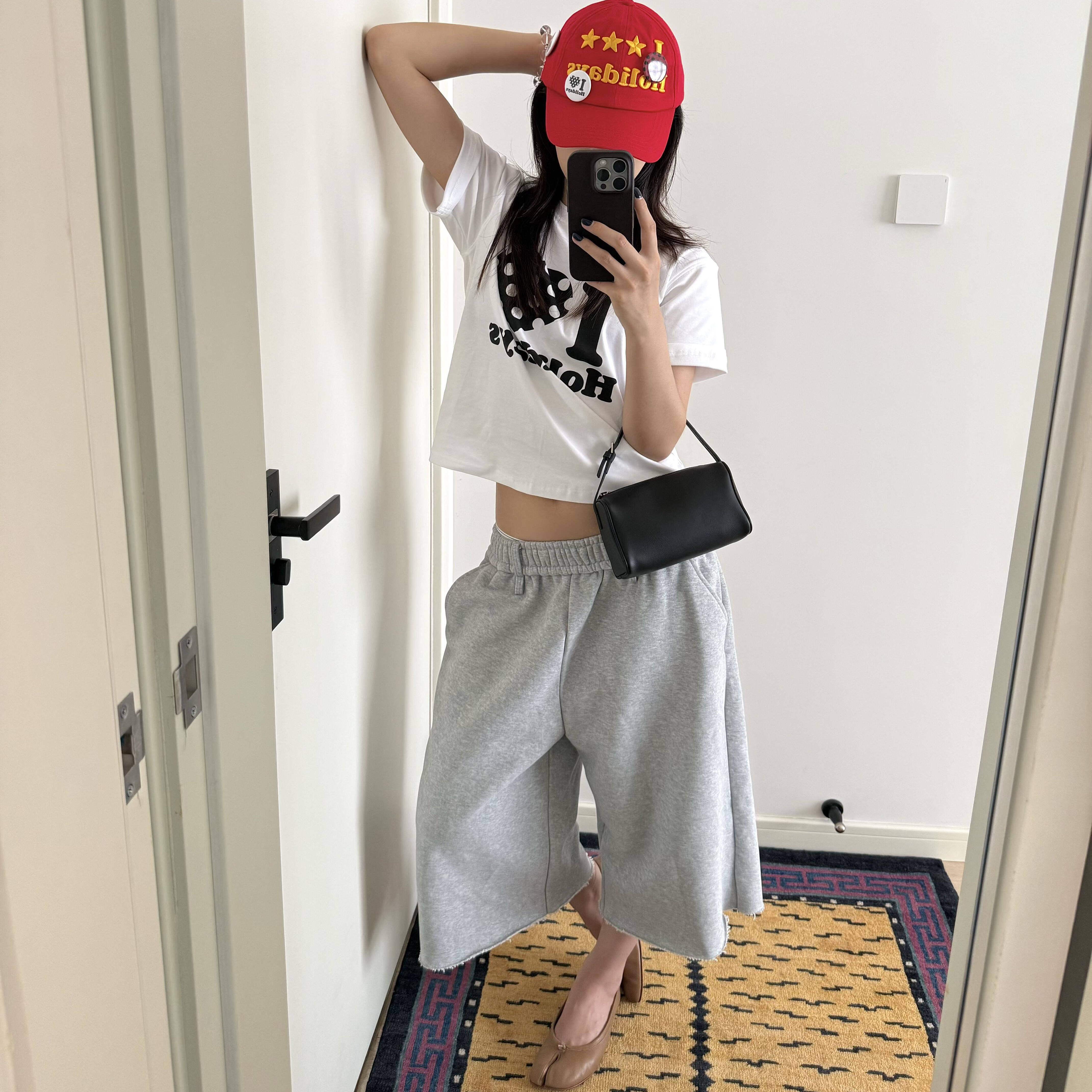 高腰百搭通勤休闲裤 美式 新款 秋季 子 复古简约灰色阔腿七分卫衣中裤