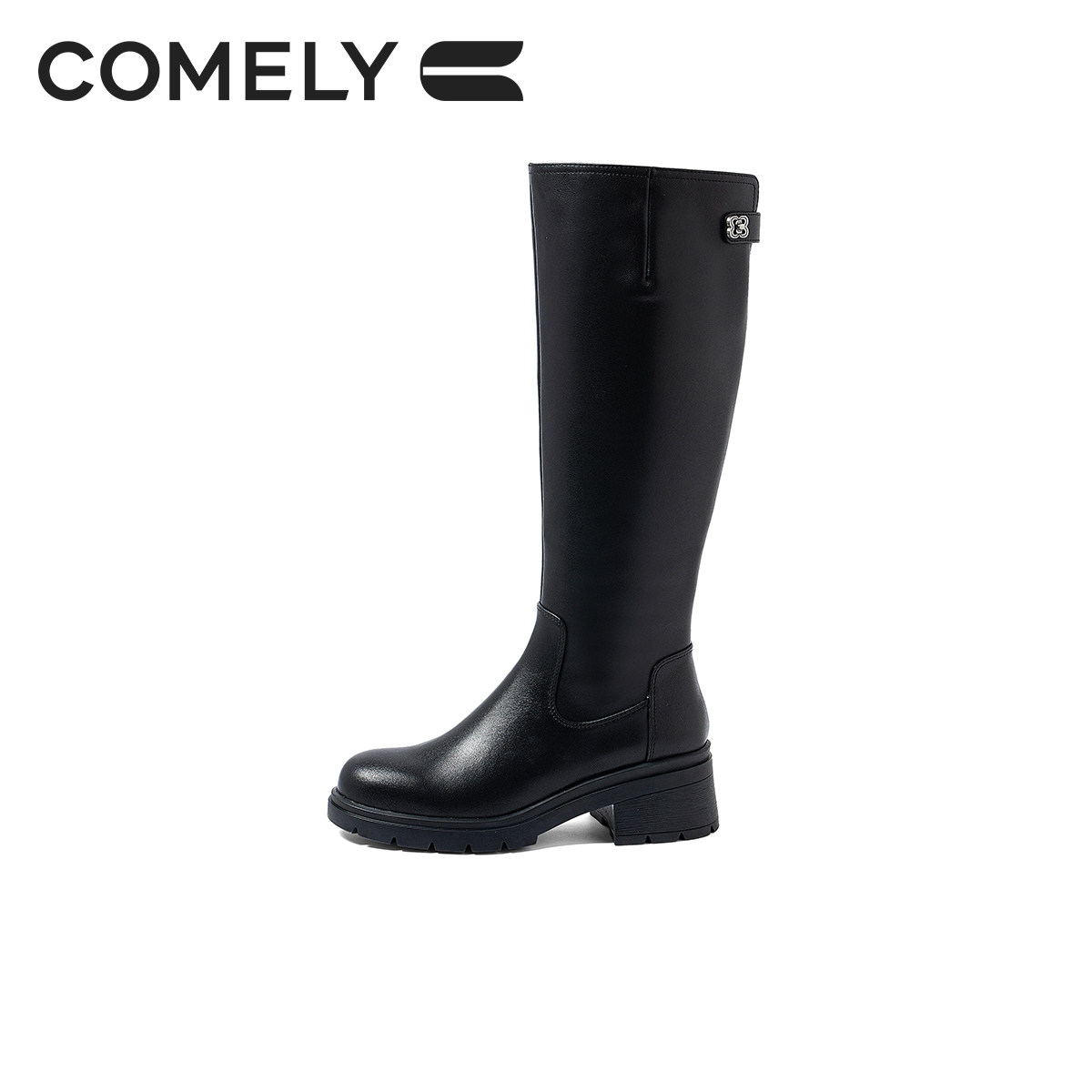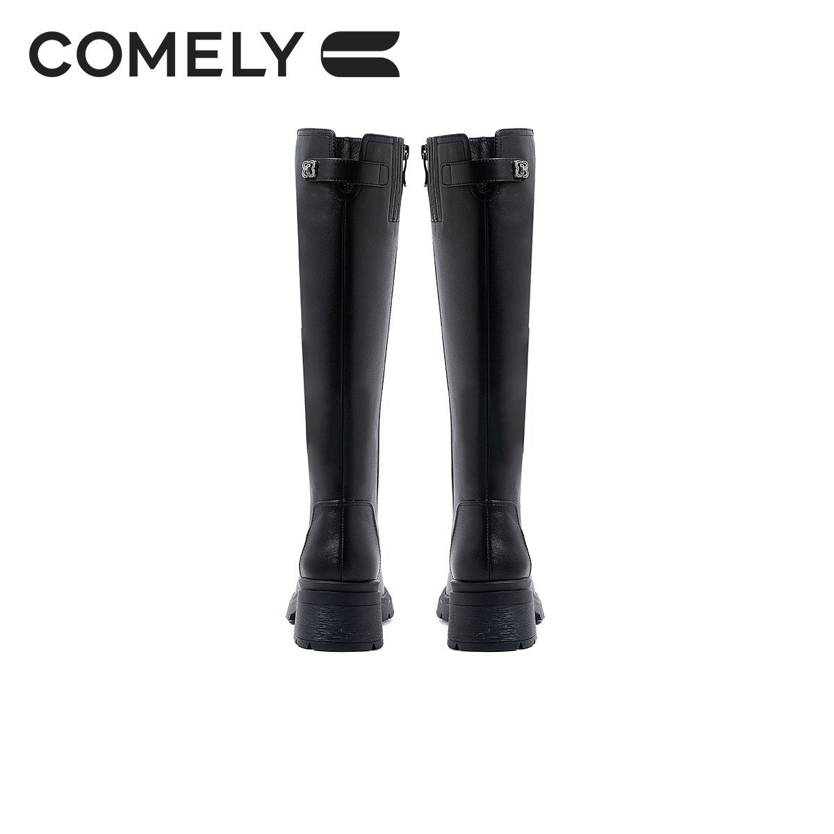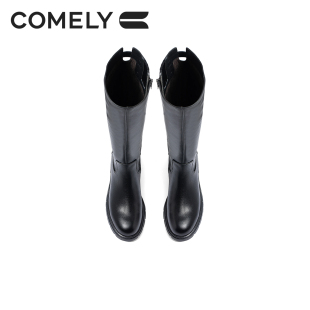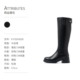 康莉牛皮骑士靴女冬真皮粗跟不过膝黑色高筒靴松糕底高跟显瘦靴子