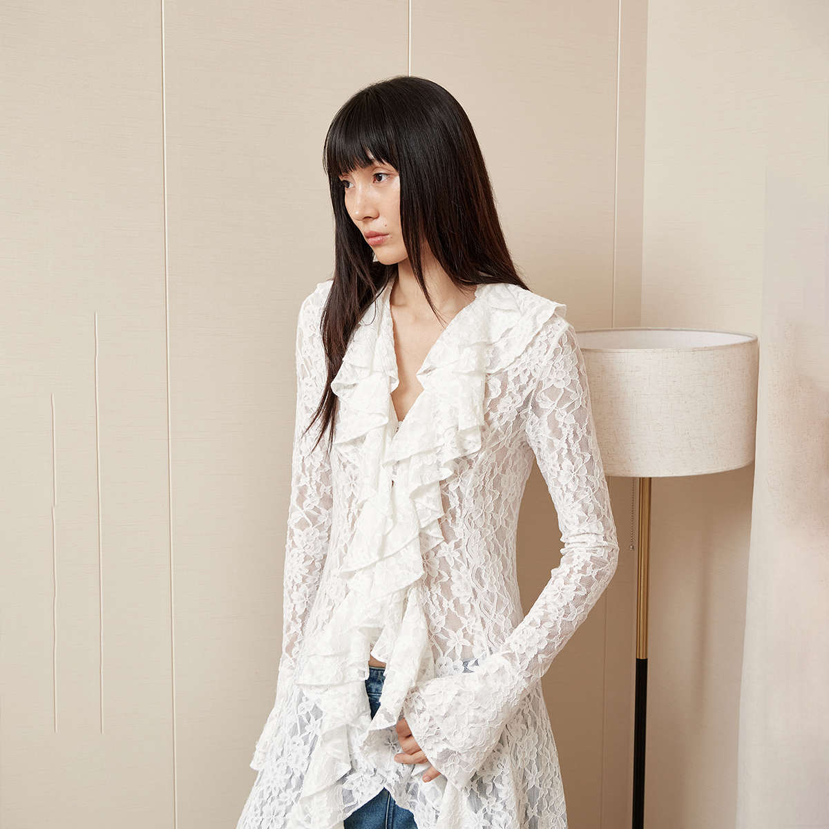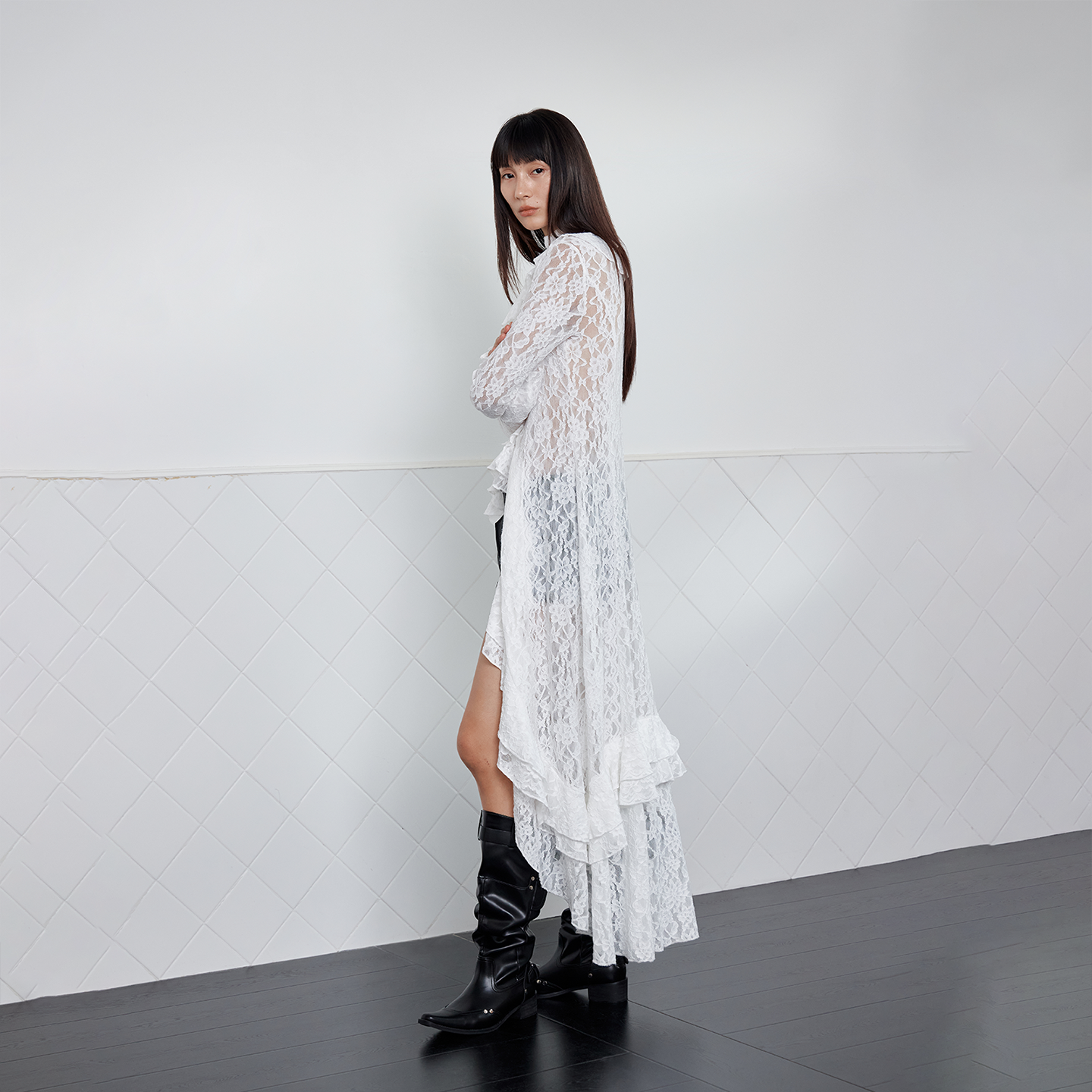 连身裙子2025新款 RURE复古荷叶边蕾丝连衣裙白色长裙秋季 流行风格