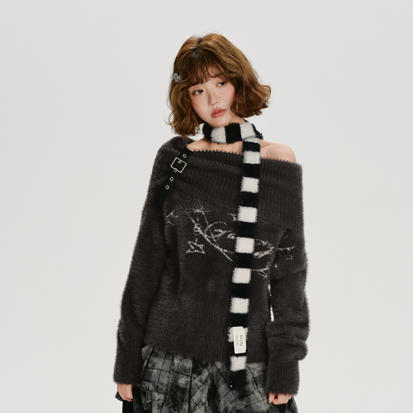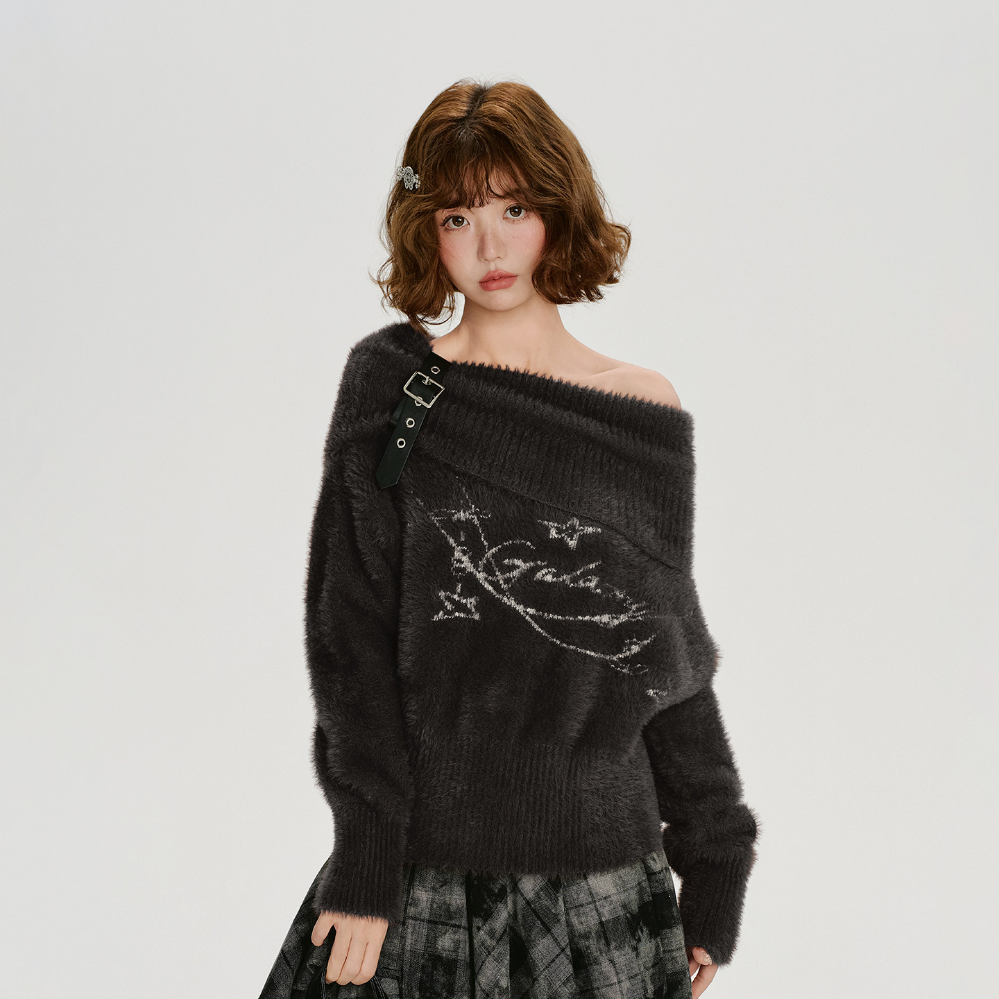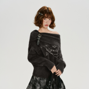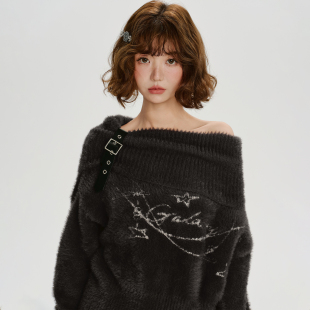 皮扣慵懒宽松上衣 新款 Girlyhalo美式 复古一字肩仿貂毛毛衣女秋季