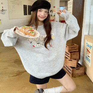 NVPVVA 上衣女 秋冬百搭LOGO米粒绣圆领毛衣韩系宽松慵懒风针织衫