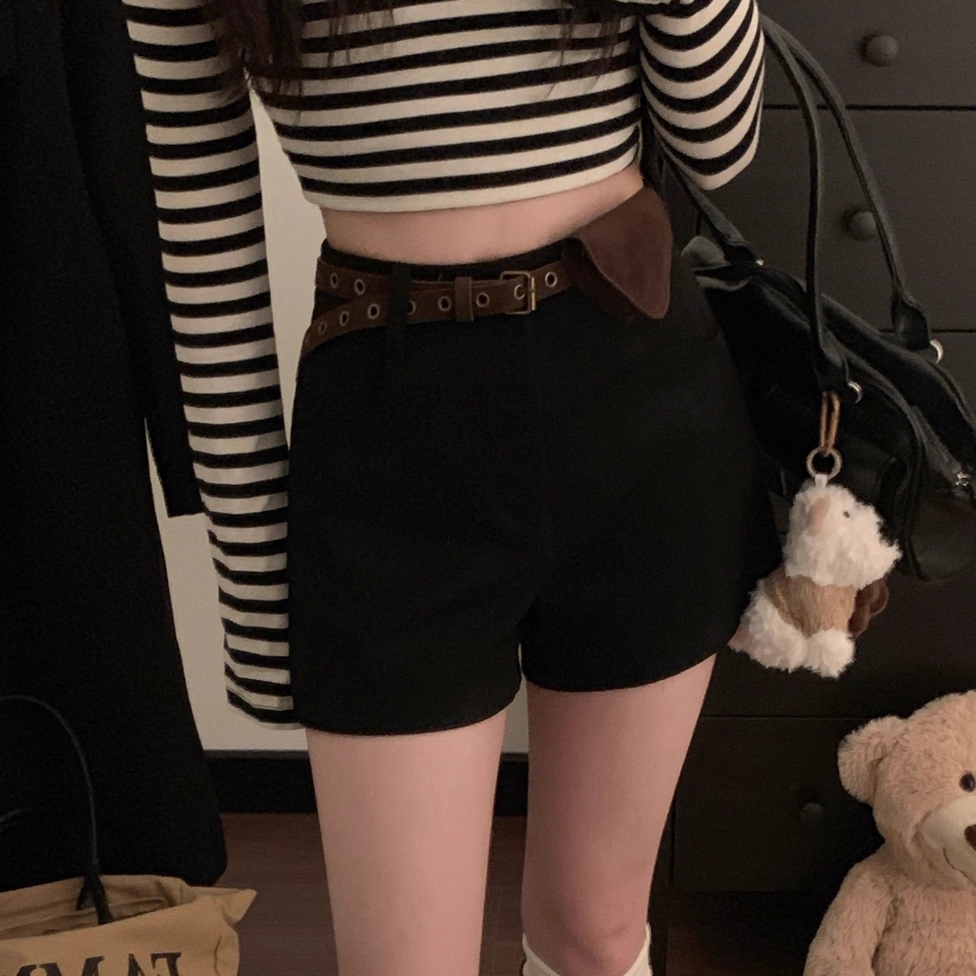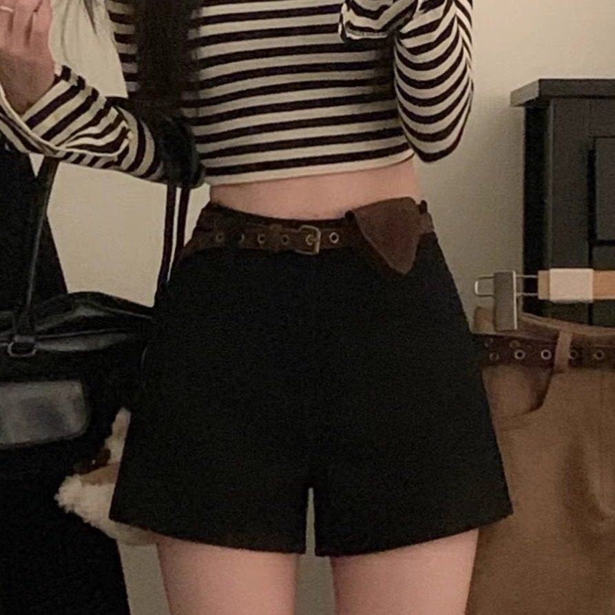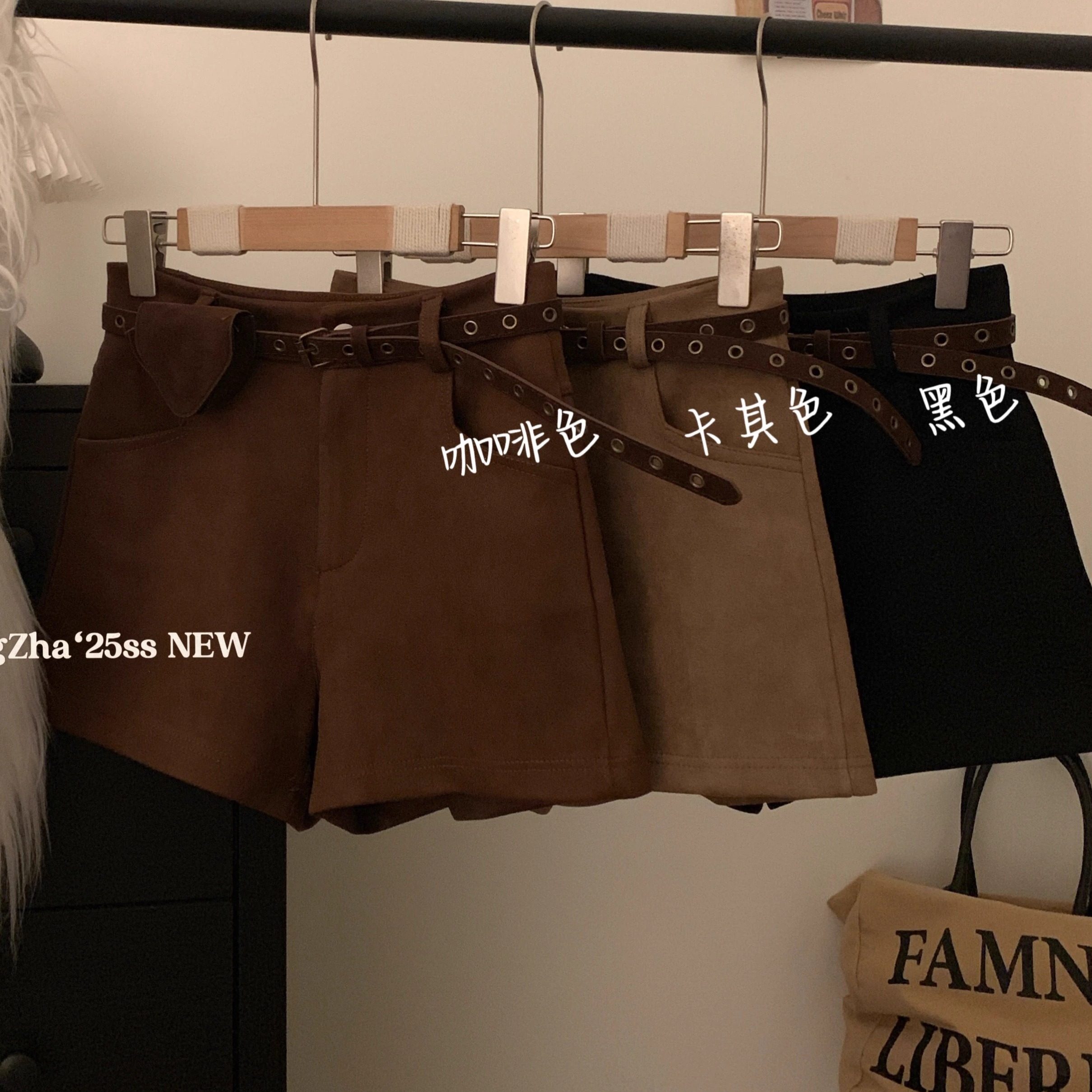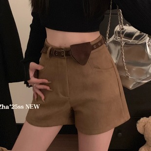 显瘦百搭直筒包臀热裤 咖色设计感复古麂皮绒高腰休闲短裤 女秋冬季