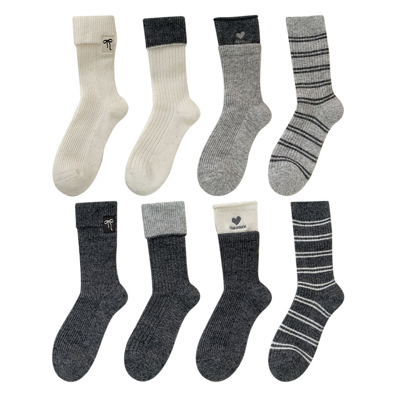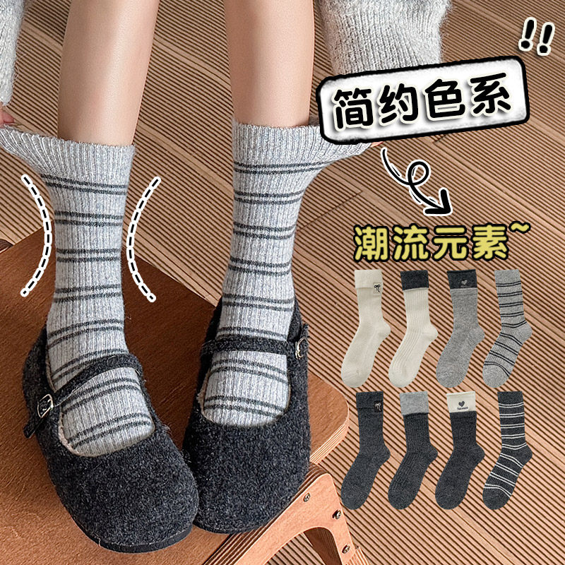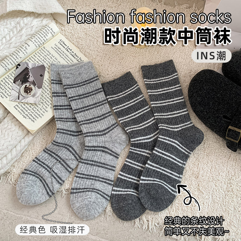 韩系中筒袜子女士纯色休闲长腰竖条纹堆堆吸汗防臭春秋款 美腿月子