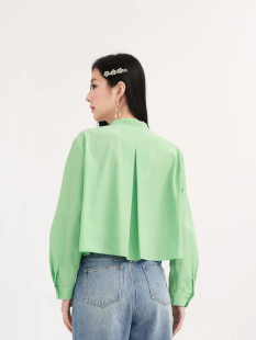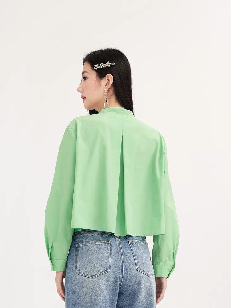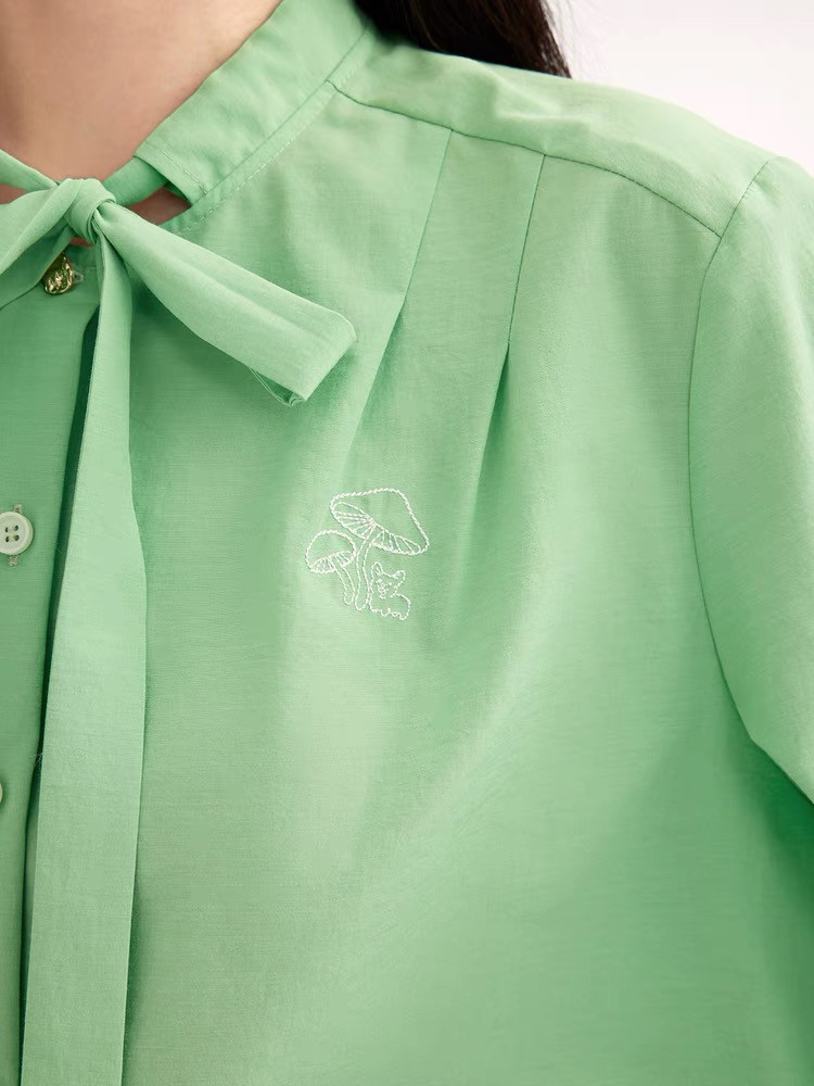 D453 设计感绣花系带领绿色薄荷曼波显瘦百搭衬衫
