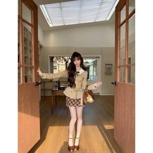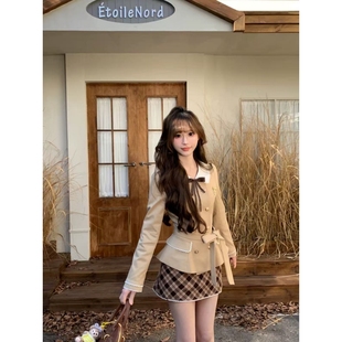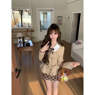 子套装 可爱少女甜美风秋冬款 裙裤 上衣高腰短款 格纹拼接海军领长袖