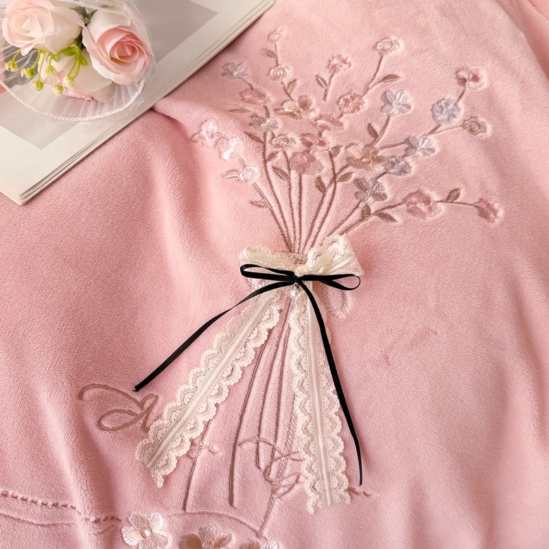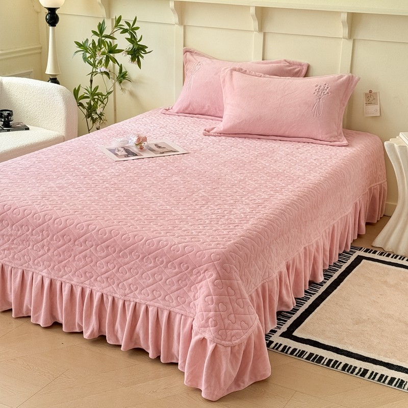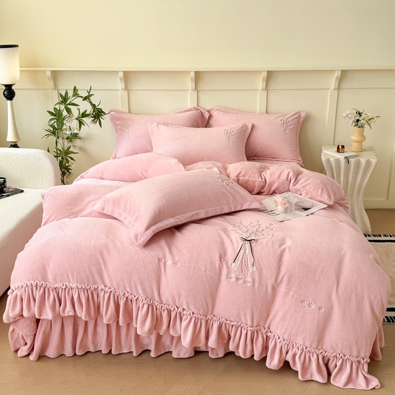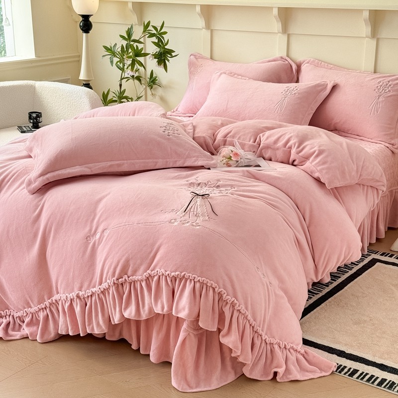 水星家纺牛奶绒绣花四件套床裙款 婴儿绒双面加厚保暖床盖被套 冬季
