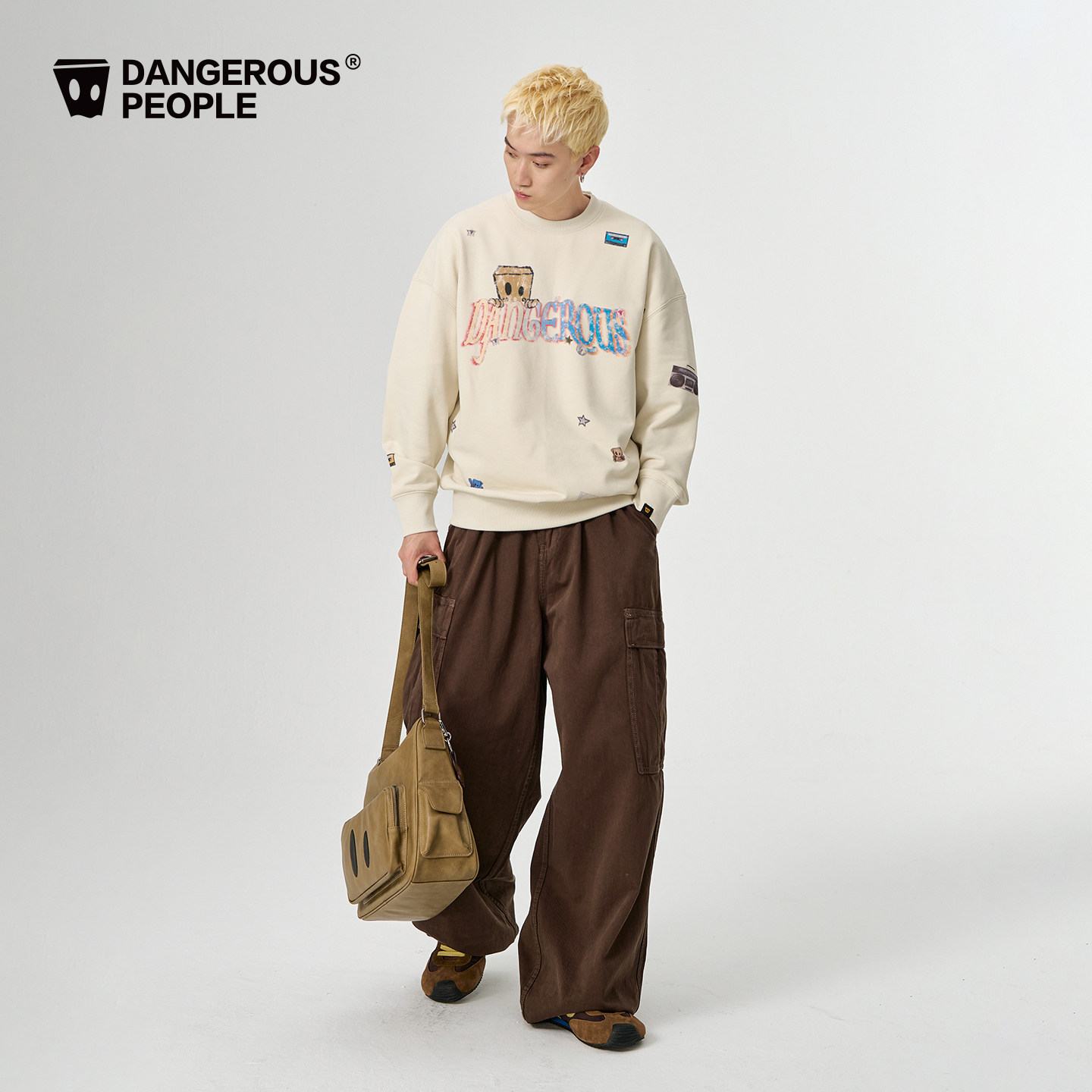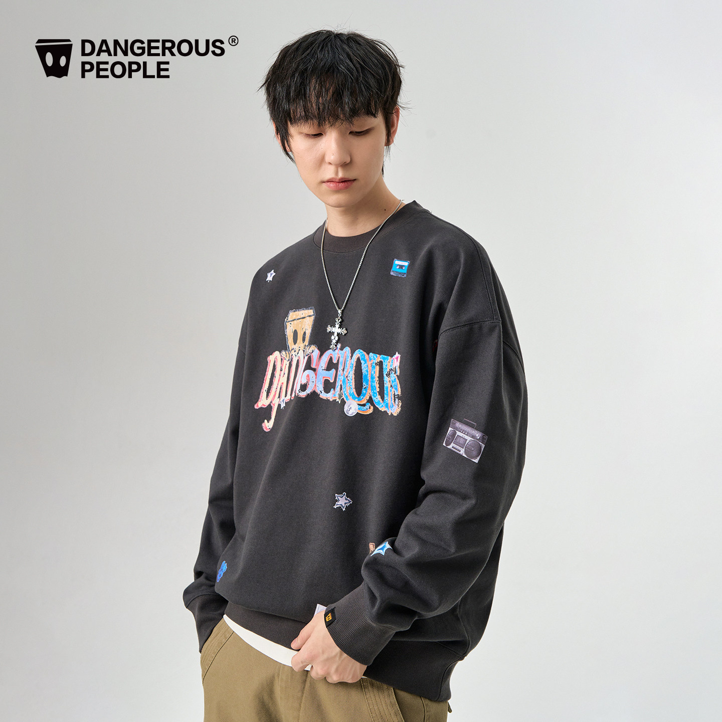 pusumede 复古圆领条纹卫衣女韩系刺绣休闲慵懒宽松上衣 松弛漫旅