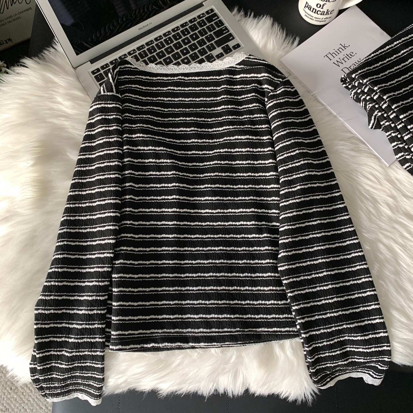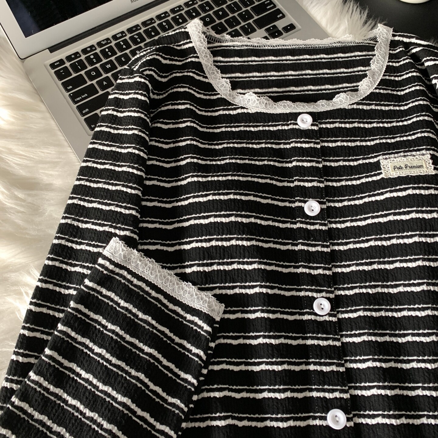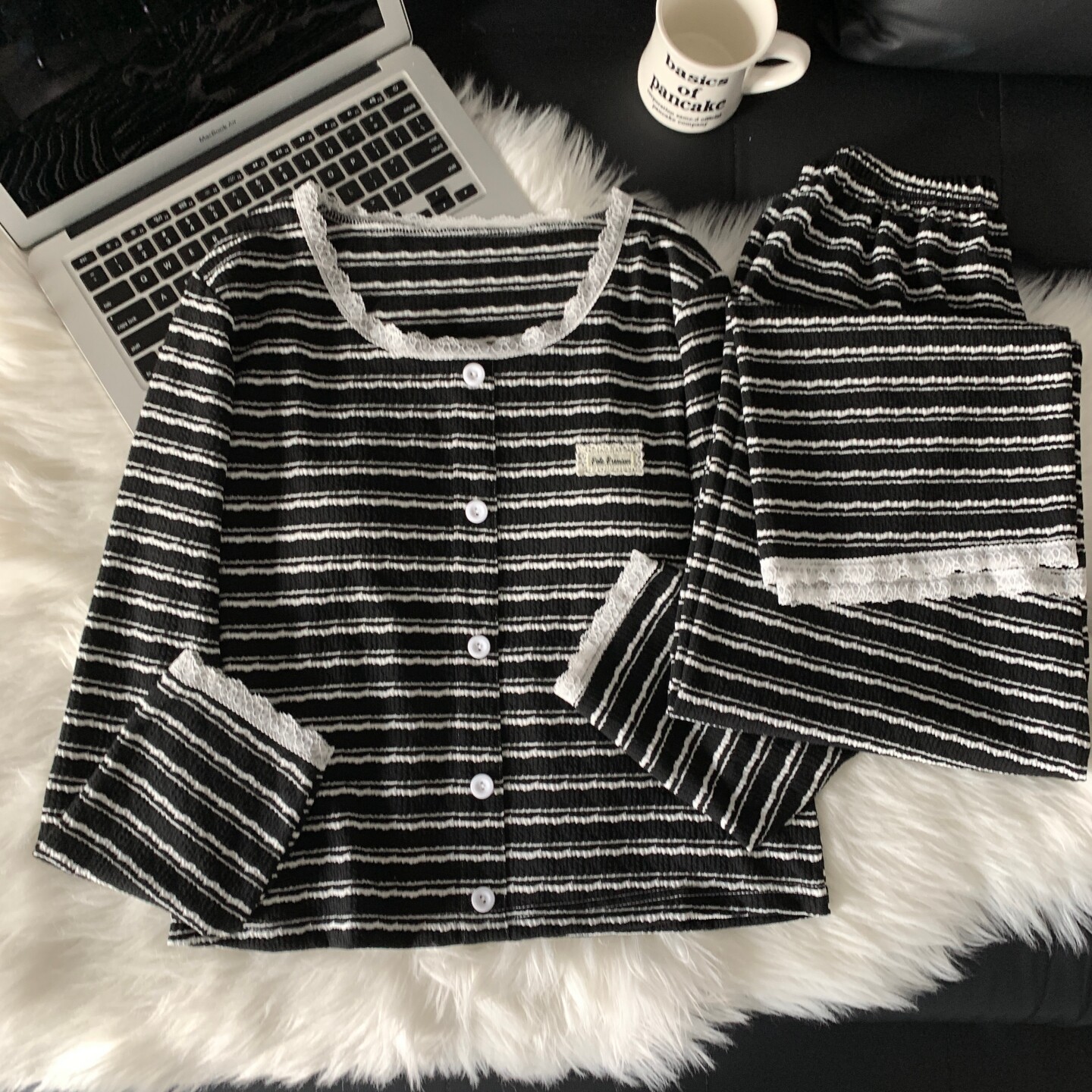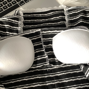 长裤 纯棉蕾丝边领口条纹长袖 两件套家居服 新款 带胸垫睡衣女春秋季