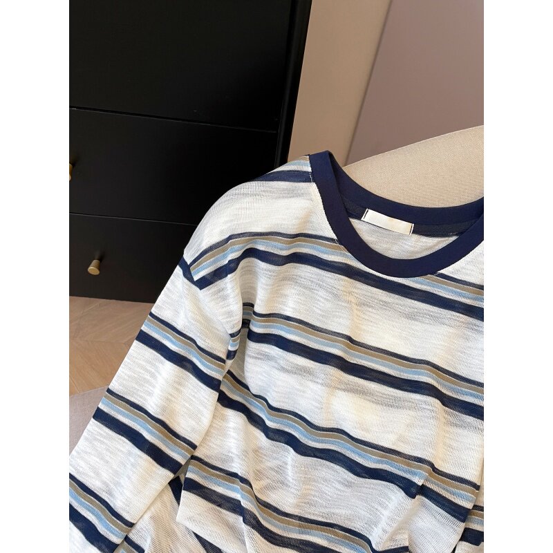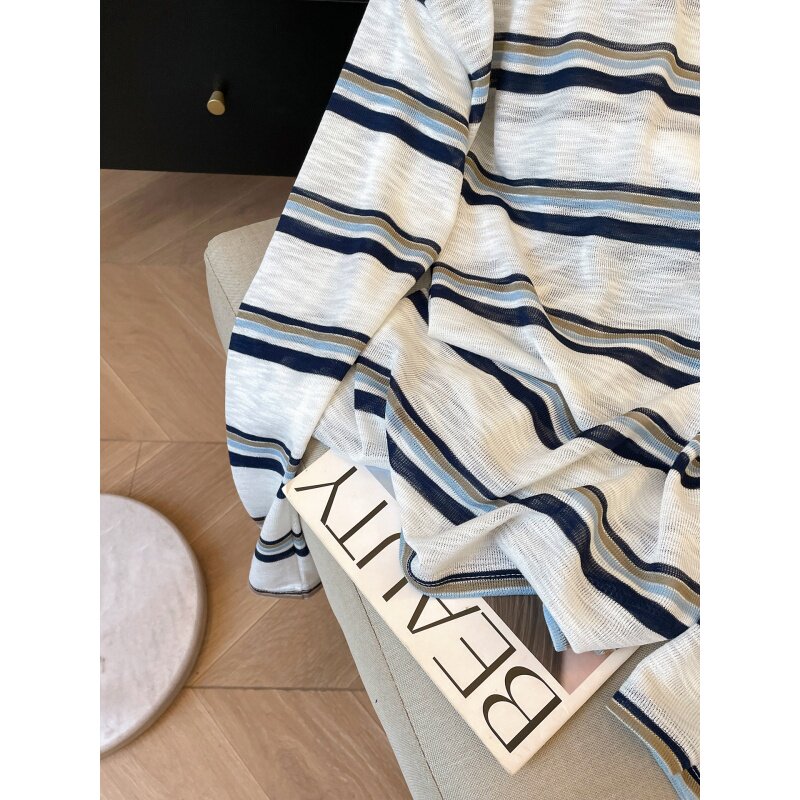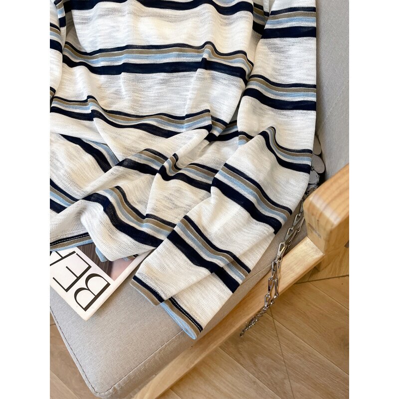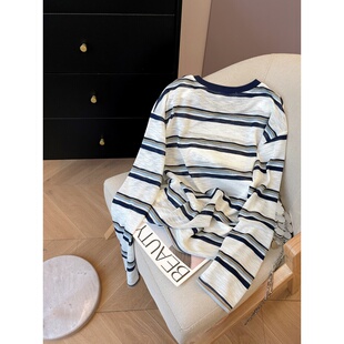 外搭宽松慵懒风微透长袖 奥特莱斯 女秋季 余单条纹针织罩衫 t恤 特价