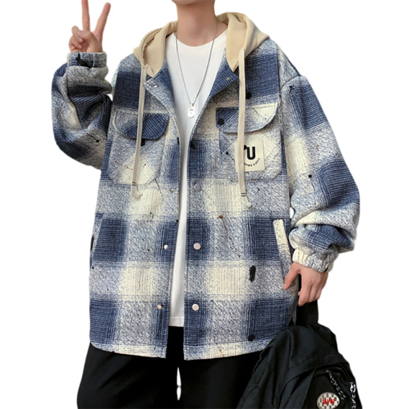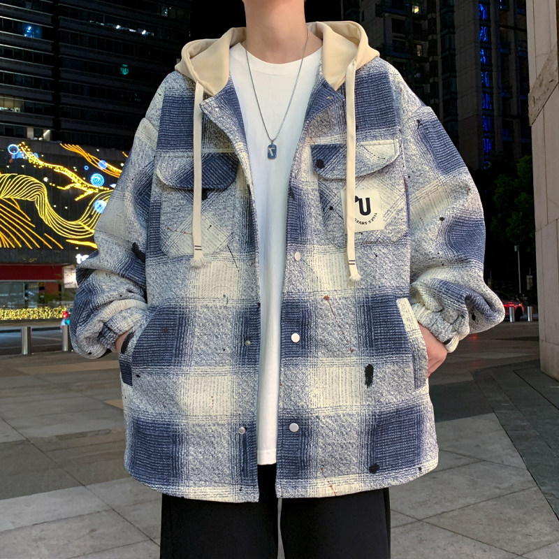 连帽外套 宽松潮流加肥加大码 青少年港风宽松格子夹克男秋冬季 新款