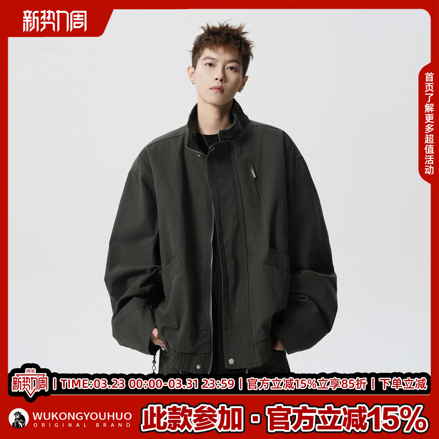 悟空有货美式 夹克男潮牌宽松情侣休闲百搭外套 复古解构拼立领工装