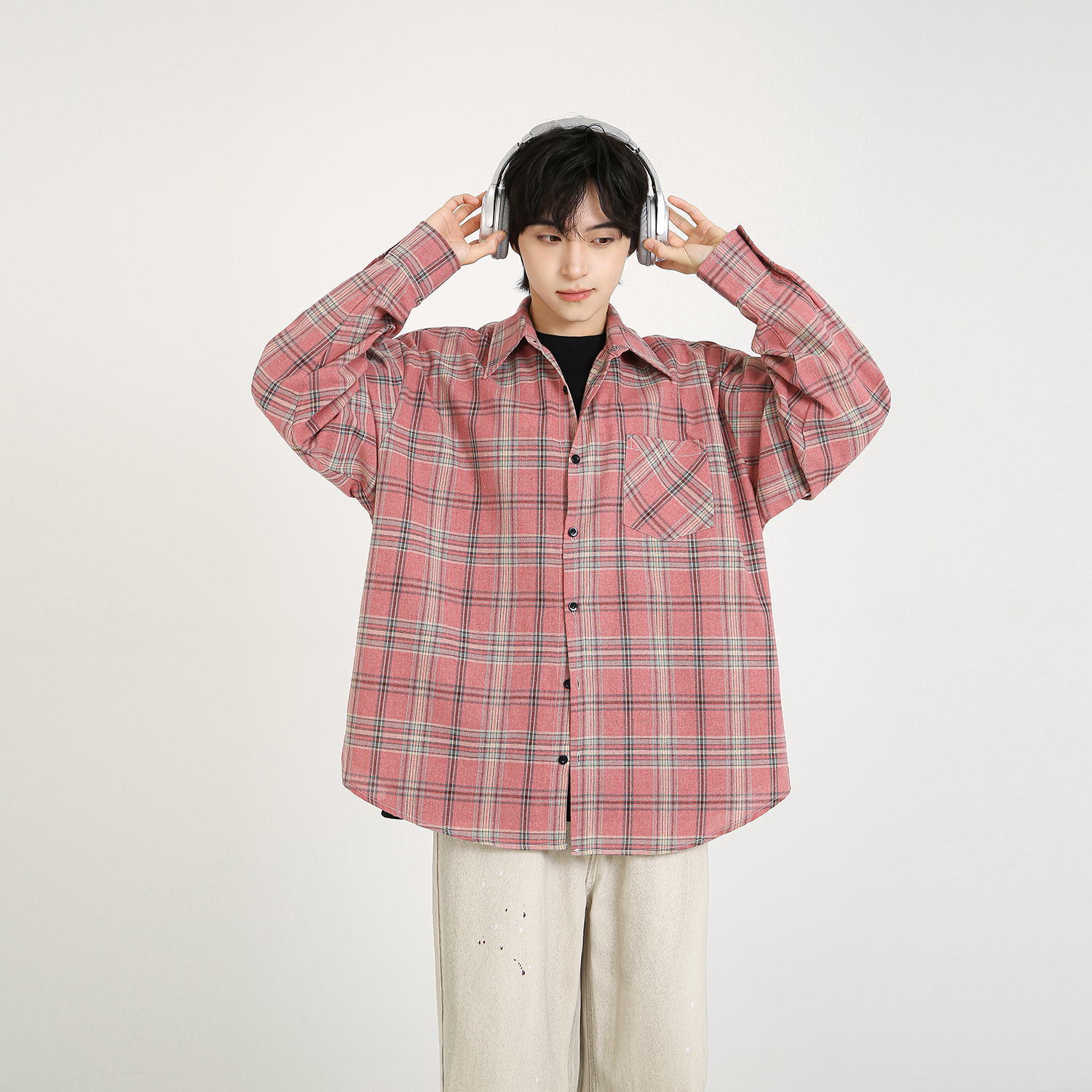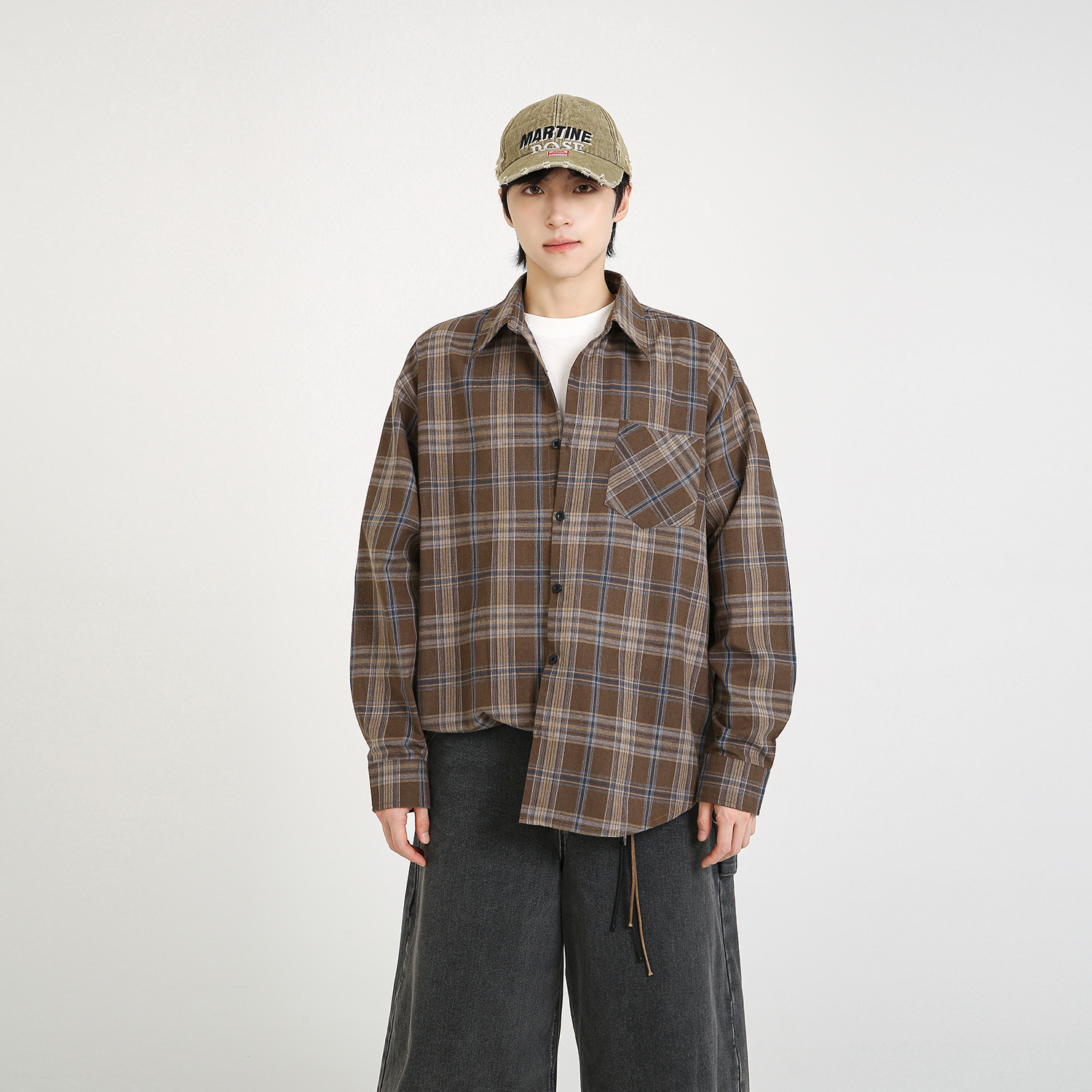 NineteenAutumn日系复古磨毛格子衬衫 衬衣上衣男 宽松港风学生长袖