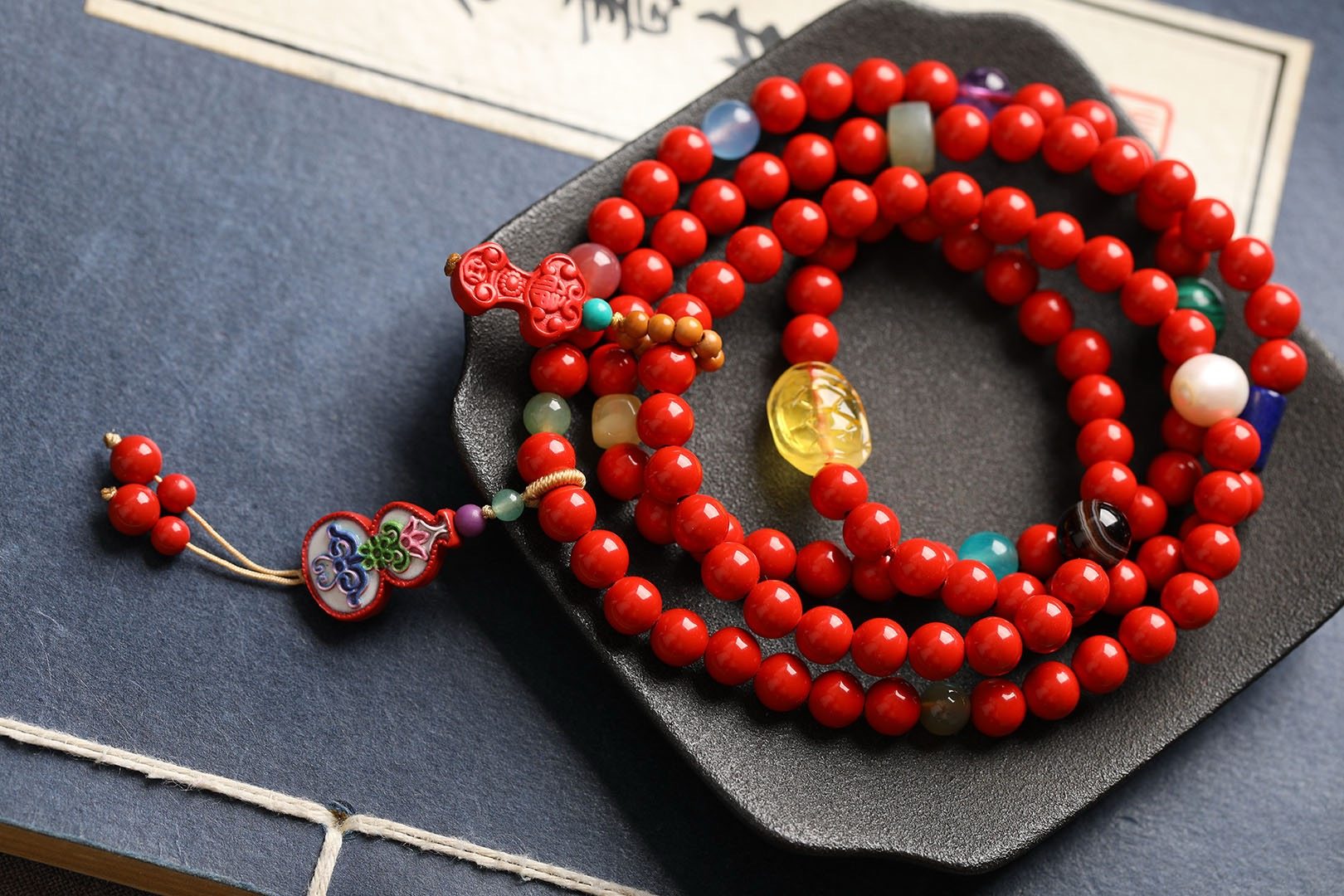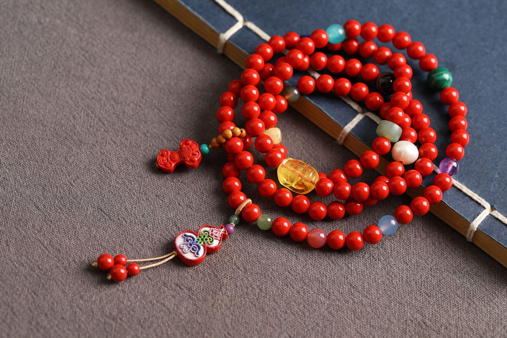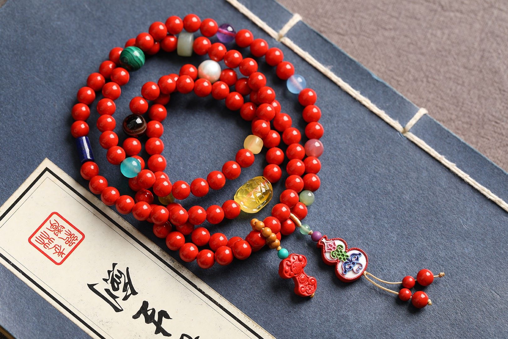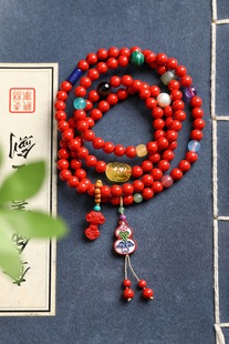 保真朱砂红砂红砂项链手链四圈108颗道系流珠天然蜜蜡珍珠孔雀石
