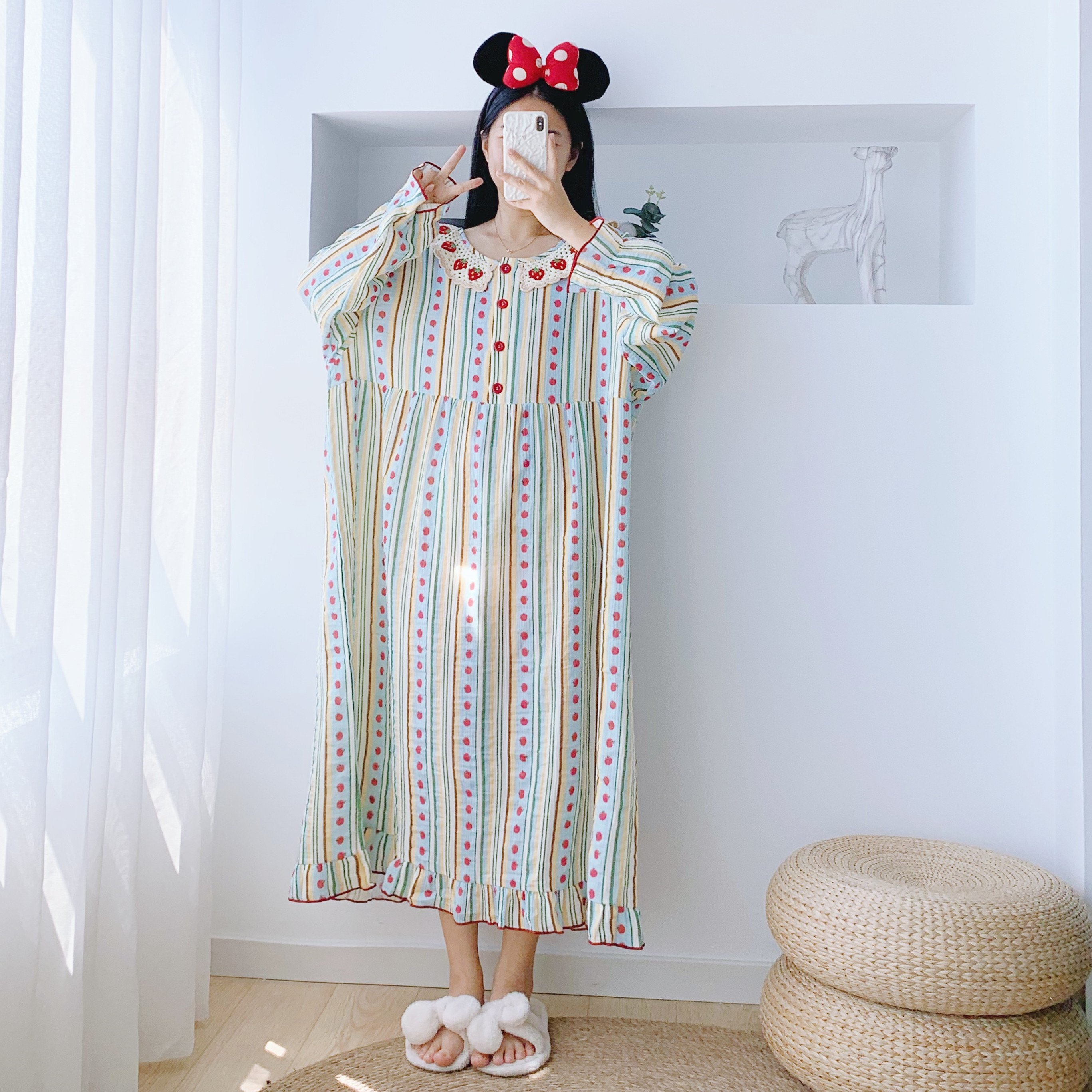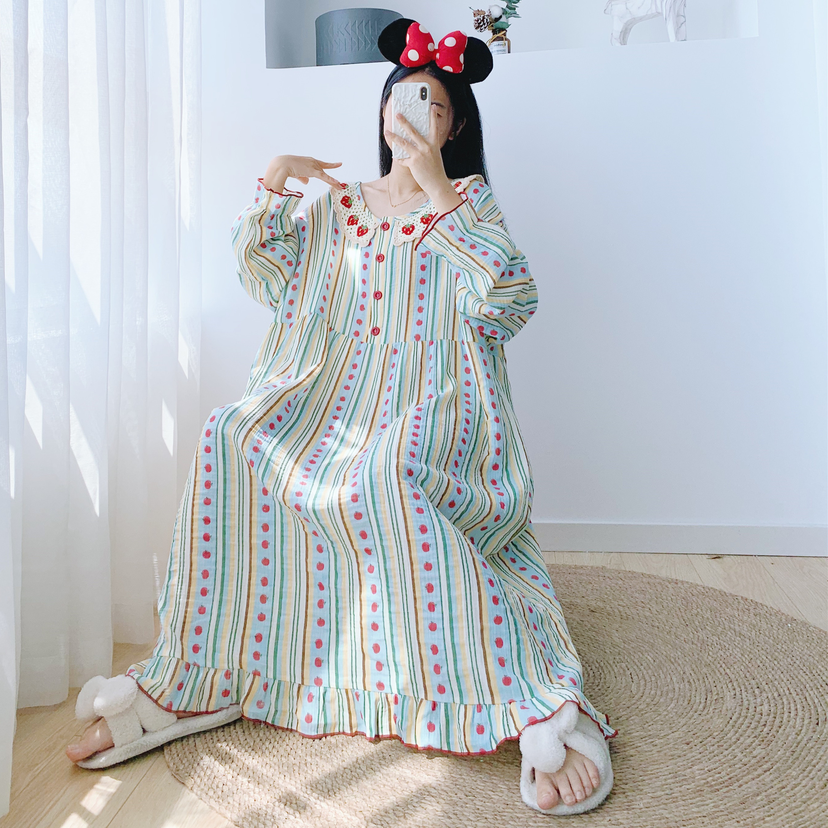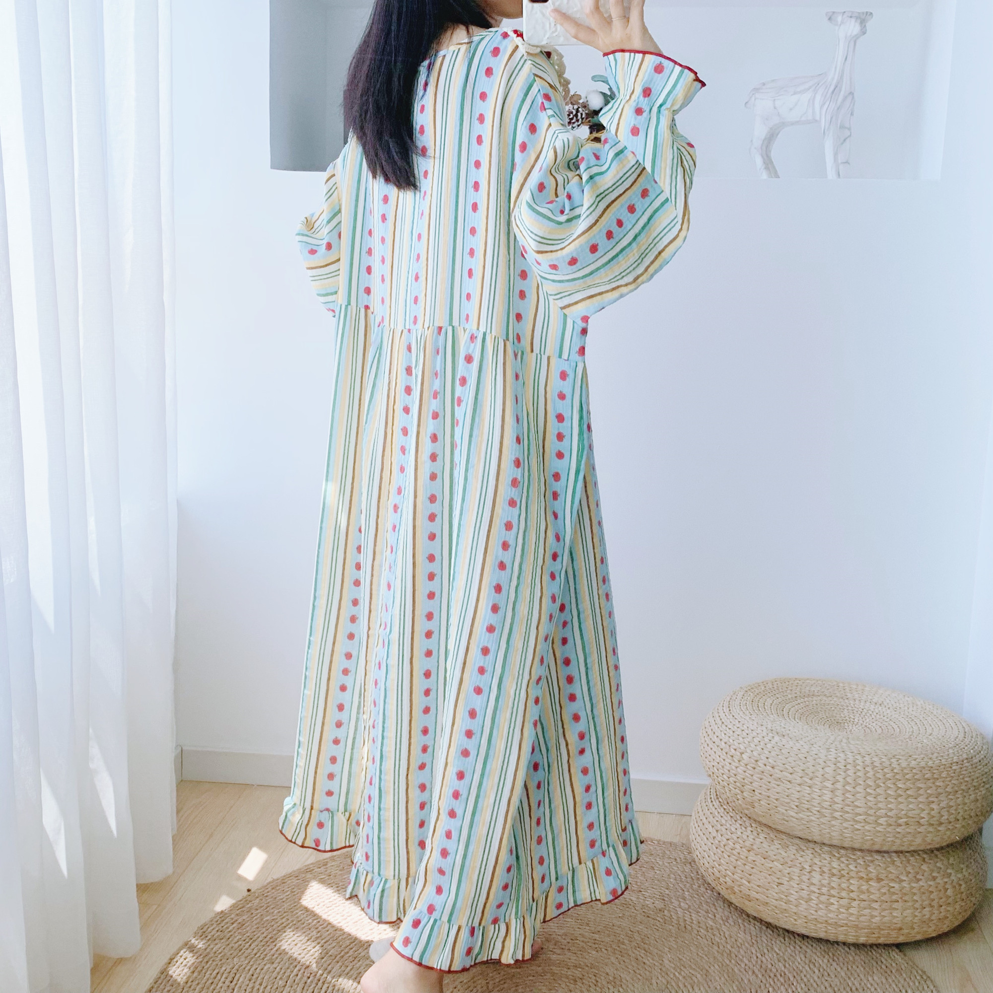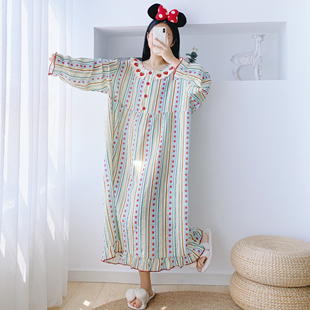 帕兰朵睡裙女春秋纯棉长袖 孕妇睡衣 甜美宽松中长连衣裙可外穿大码