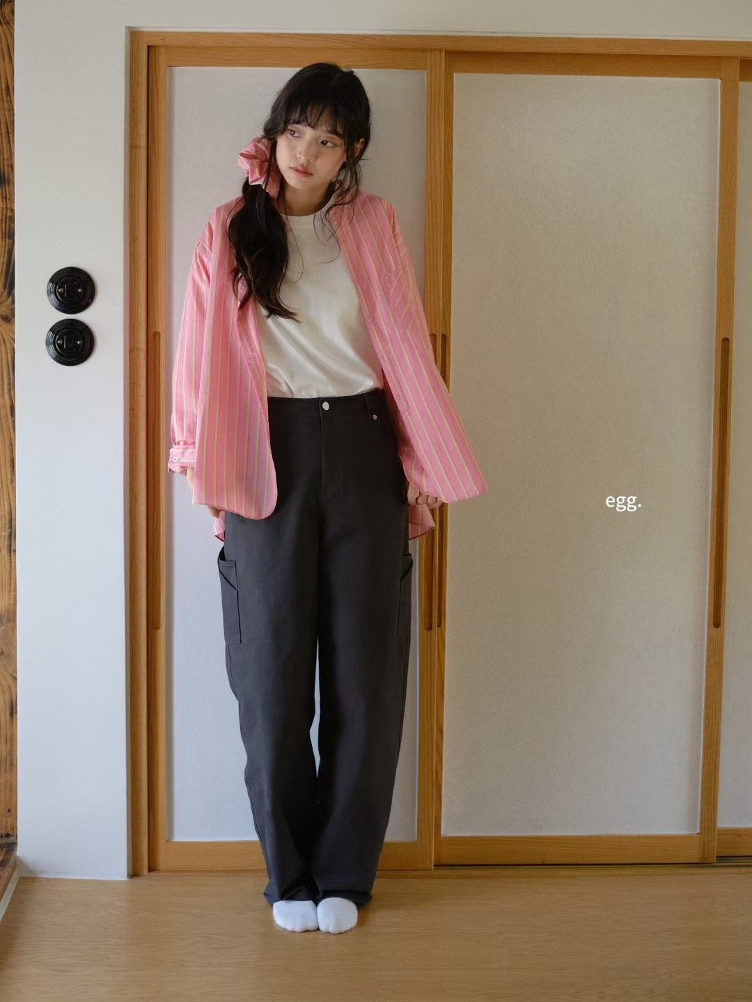 王 高腰直筒休闲阔腿裤 egg正品 裤 韩系百搭宽松多口袋工装 瘦腿裤