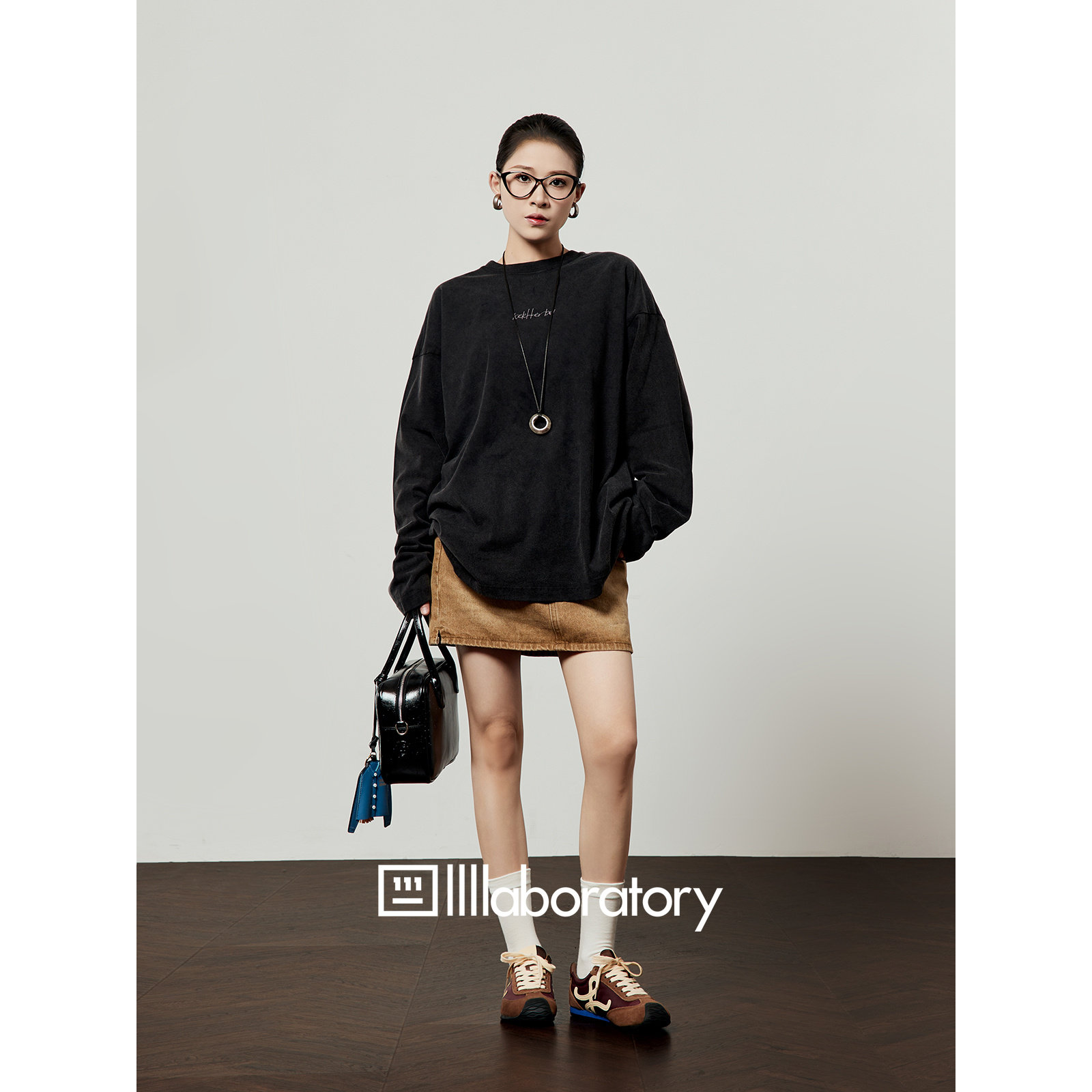 字母印花宽松简约圆领长袖 「周里物出品」黑色T恤女2026春季 新款